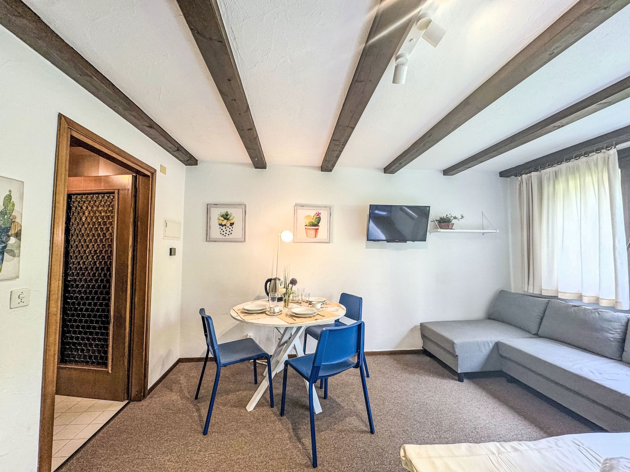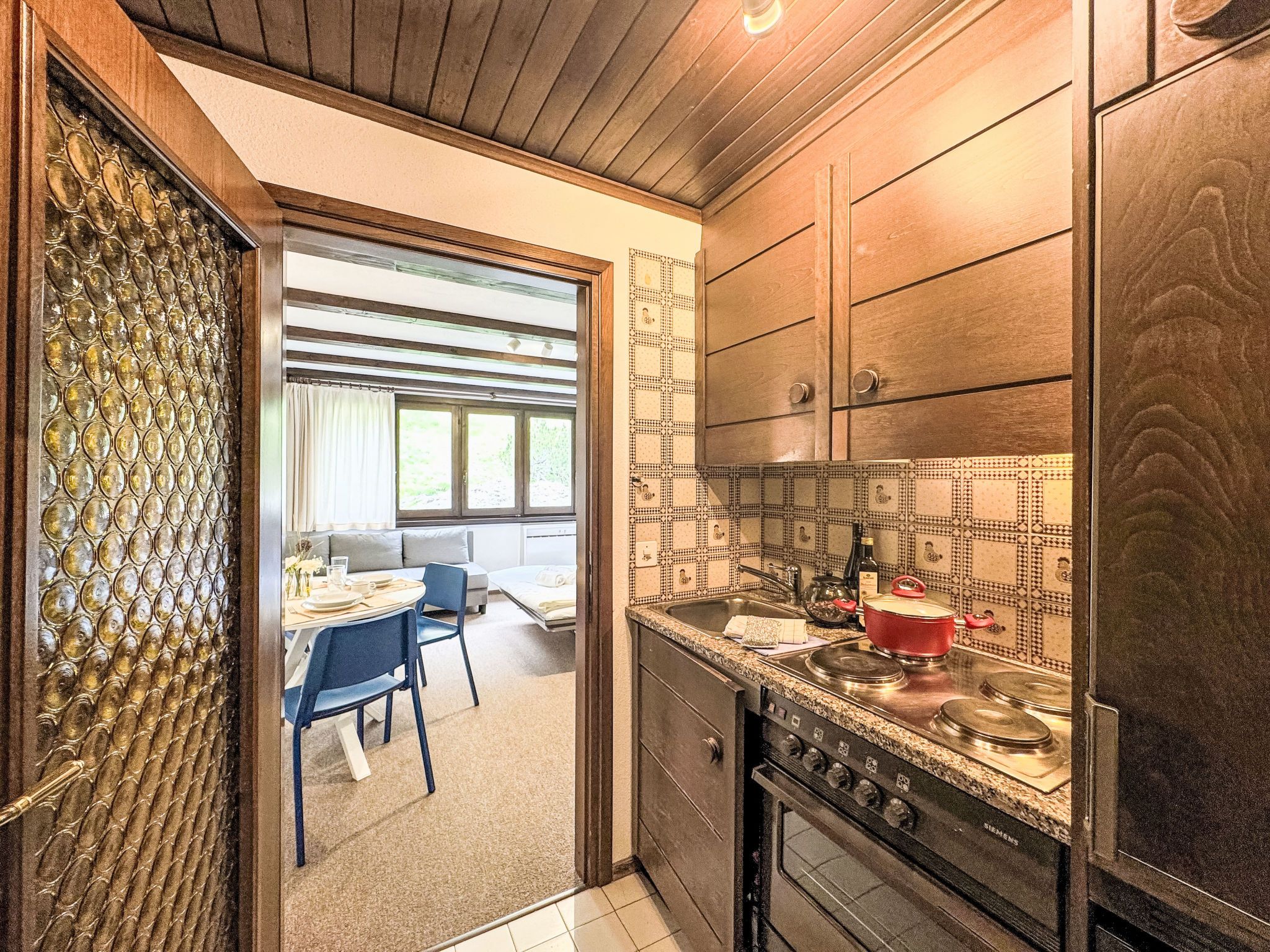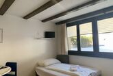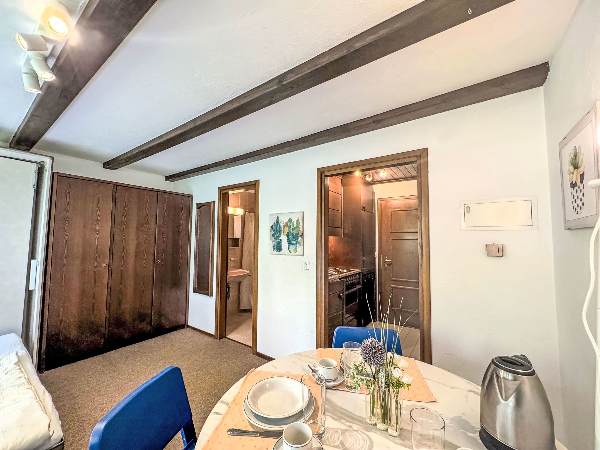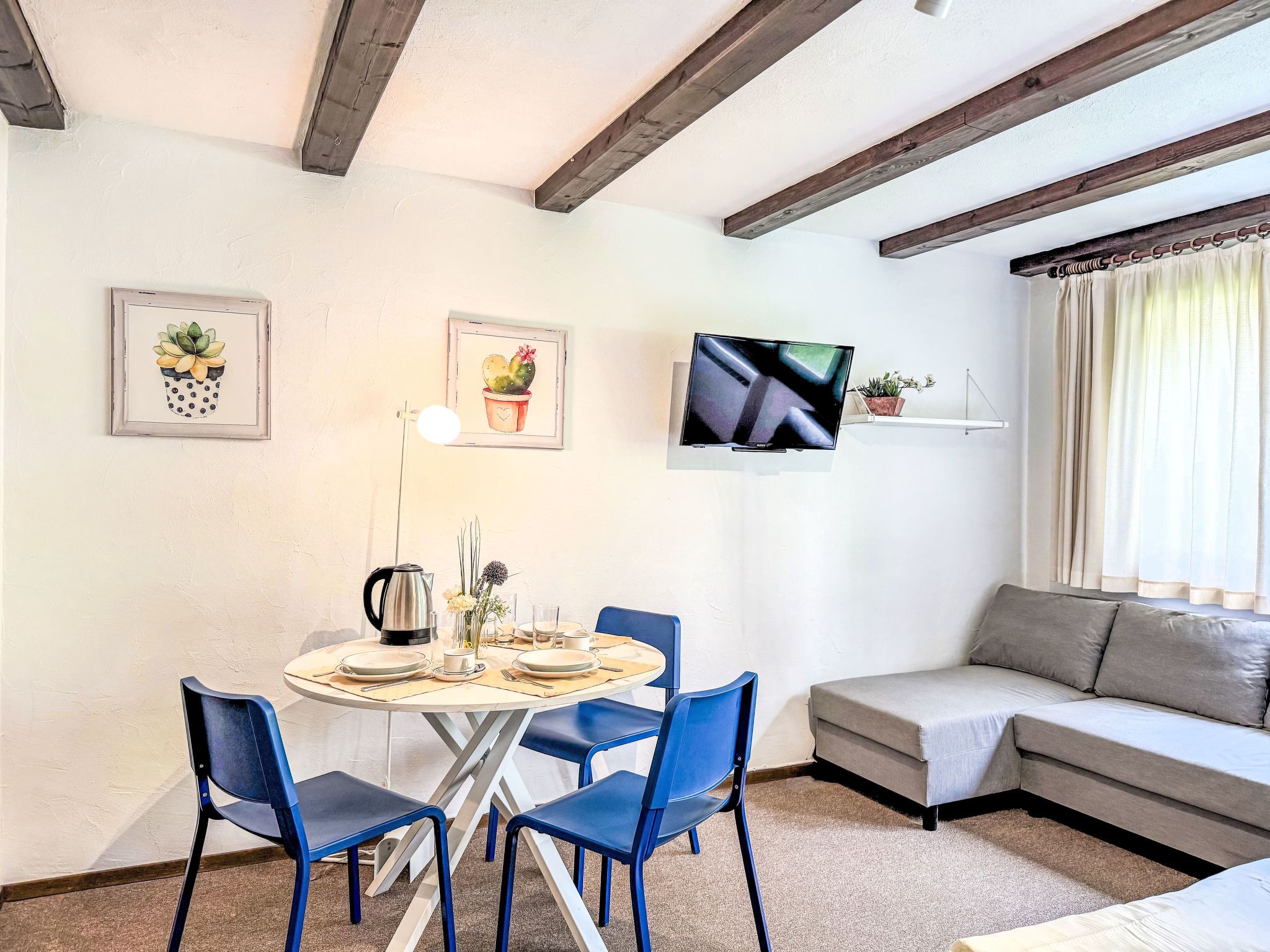 Apt. 33-1, 1-Zimmer-Wohnung 32 m2, im Erdgeschoss, Nordlage. Objekt geeignet für 2 Erwachsene + 1 Kind. Komfortabel und gemütlich eingerichtet: Wohn-/Esszimmer mit 1 Diwanbett (140 cm, Länge 190 cm), 1 Doppelwandschrankbett (160 cm, Länge 190 cm), Digital-TV und Flachbildschirm. (4 Kochplatten, Backofen, Geschirrspüler, Tiefkühler, elektrische Kaffeemaschine) mit 1 Diwanbett (130 cm, Länge 190 cm). Dusche/WC. Heizung. Teppichboden. Zur Verfügung: Internet (WLAN, gratis). Garage (1 Auto), Höhe 203 cm, Breite 350 cm. Bitte beachten: Wohnung auf Hofseite. Maximal 1 Haustier/Hund erlaubt.