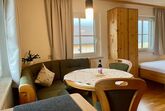 Unser großes Dreibettzimmer im 1. Stock, mit Blick auf das Wannenjoch, ist mit Dusche/WC, en Suite Waschbereich, Haartrockner, gemütlicher Sitzecke und SAT/Smart-TV ausgestattet. Frische Bettwäsche und Handtücher sind selbstverständlich vorhanden und werden nach Bedarf ausgetauscht.