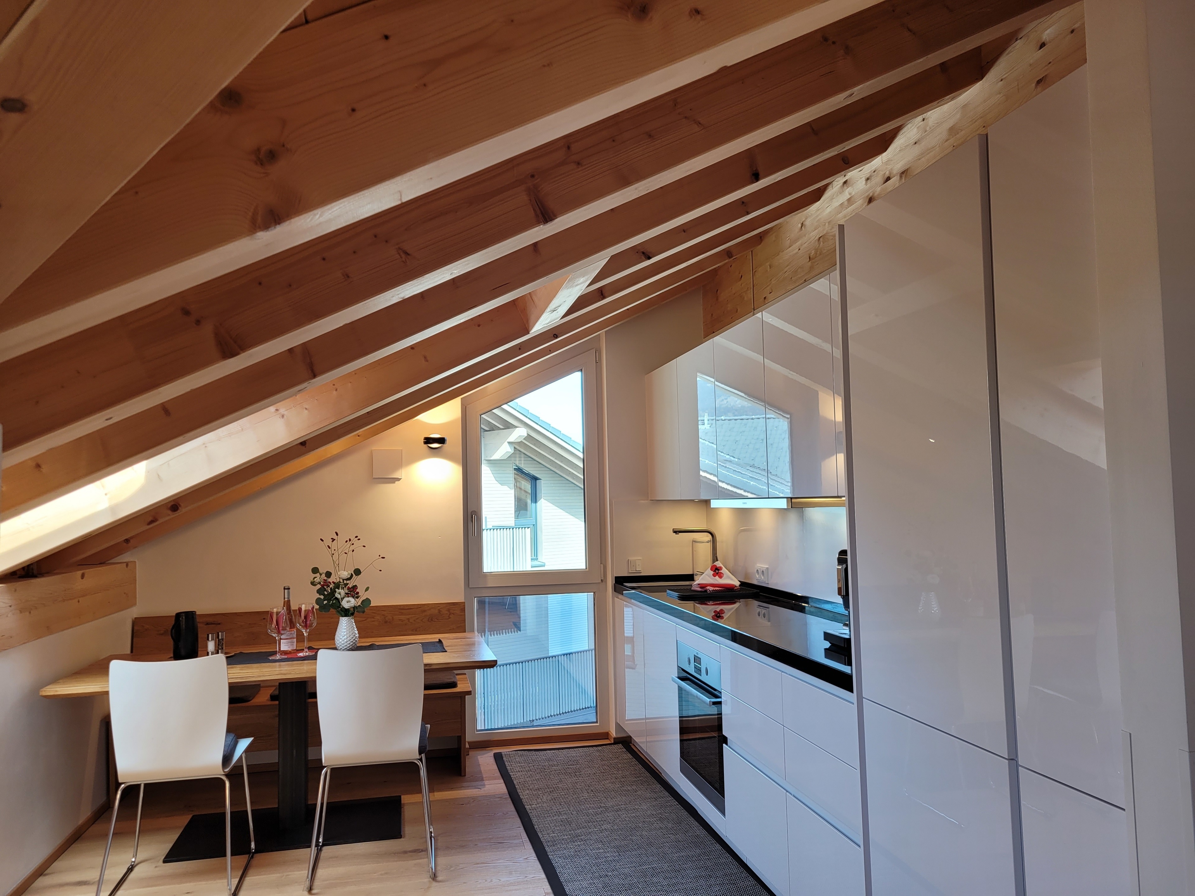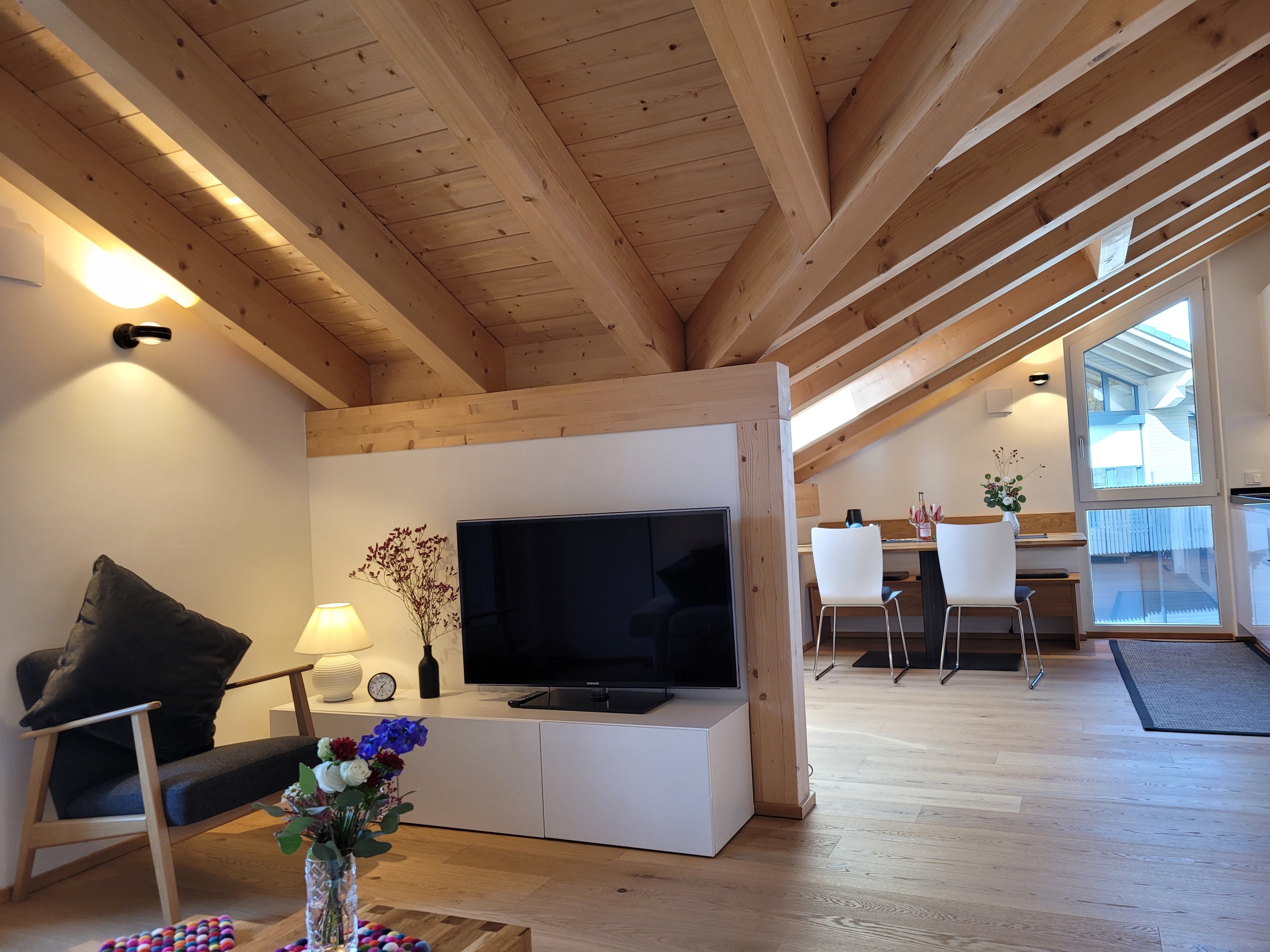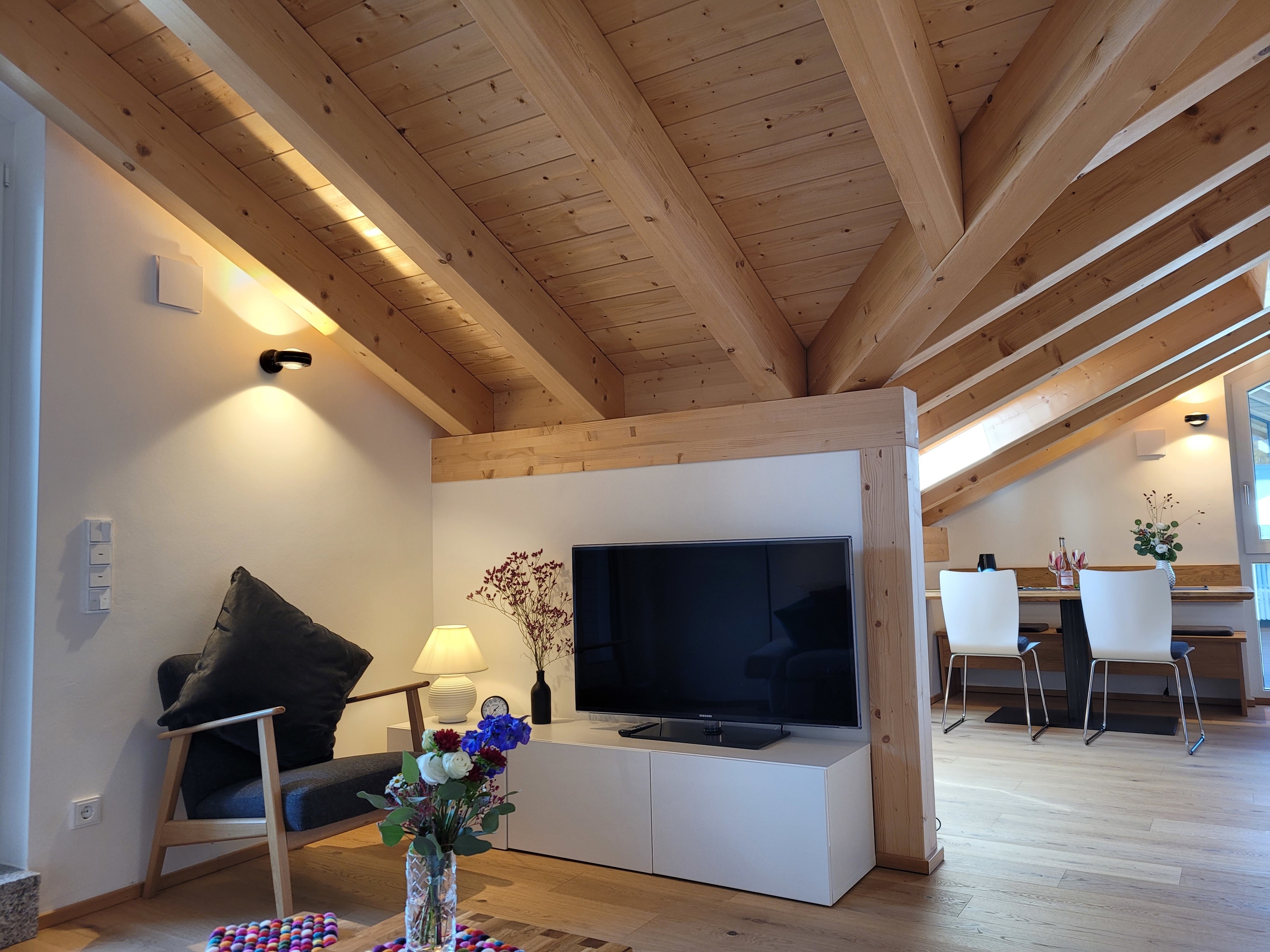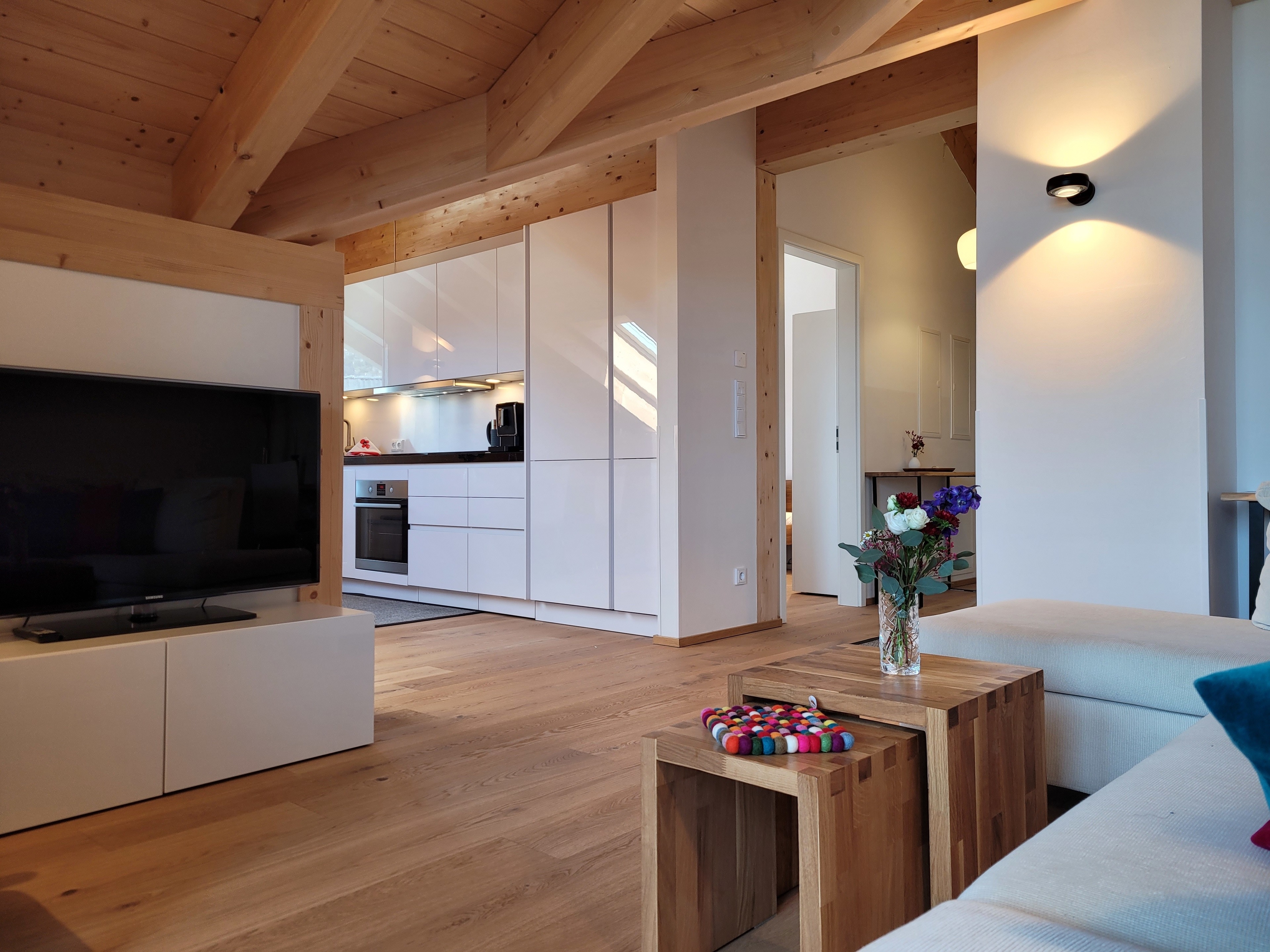 Die qualitativ sehr hochwertig ausgestattete Ferienwohnung bietet angenehmsten Komfort für bis zu 4 Personen. Der hohe offene Dachstuhl, die Dachfenster, die nachhaltigen Eichen Massivholzmöbel und das Eiche-Naturholzparkett mit Fussbodenheizung garantieren eine Wohlfühlgemütlichkeit und strahlen eine alpenländische Atmosphäre aus.