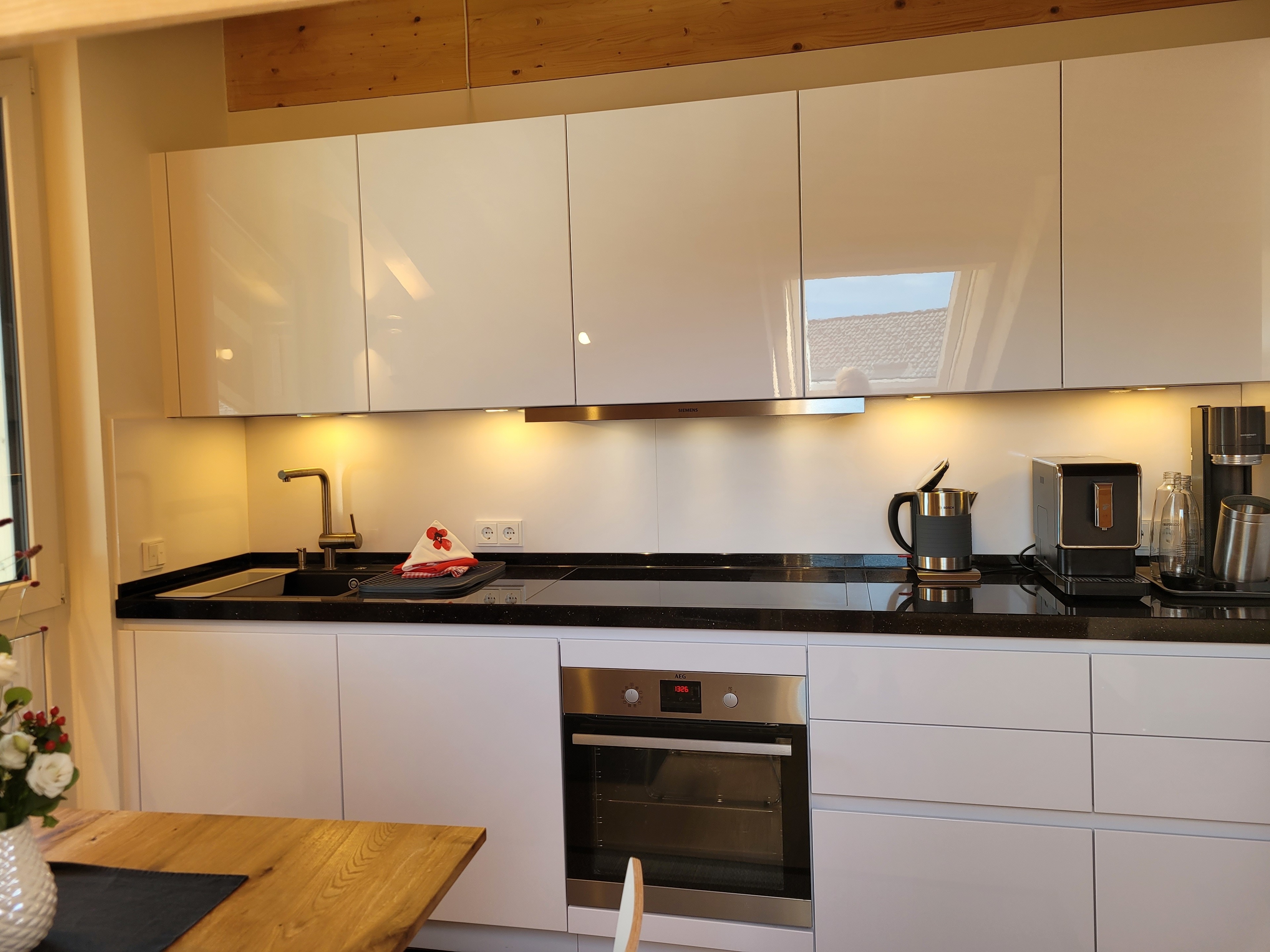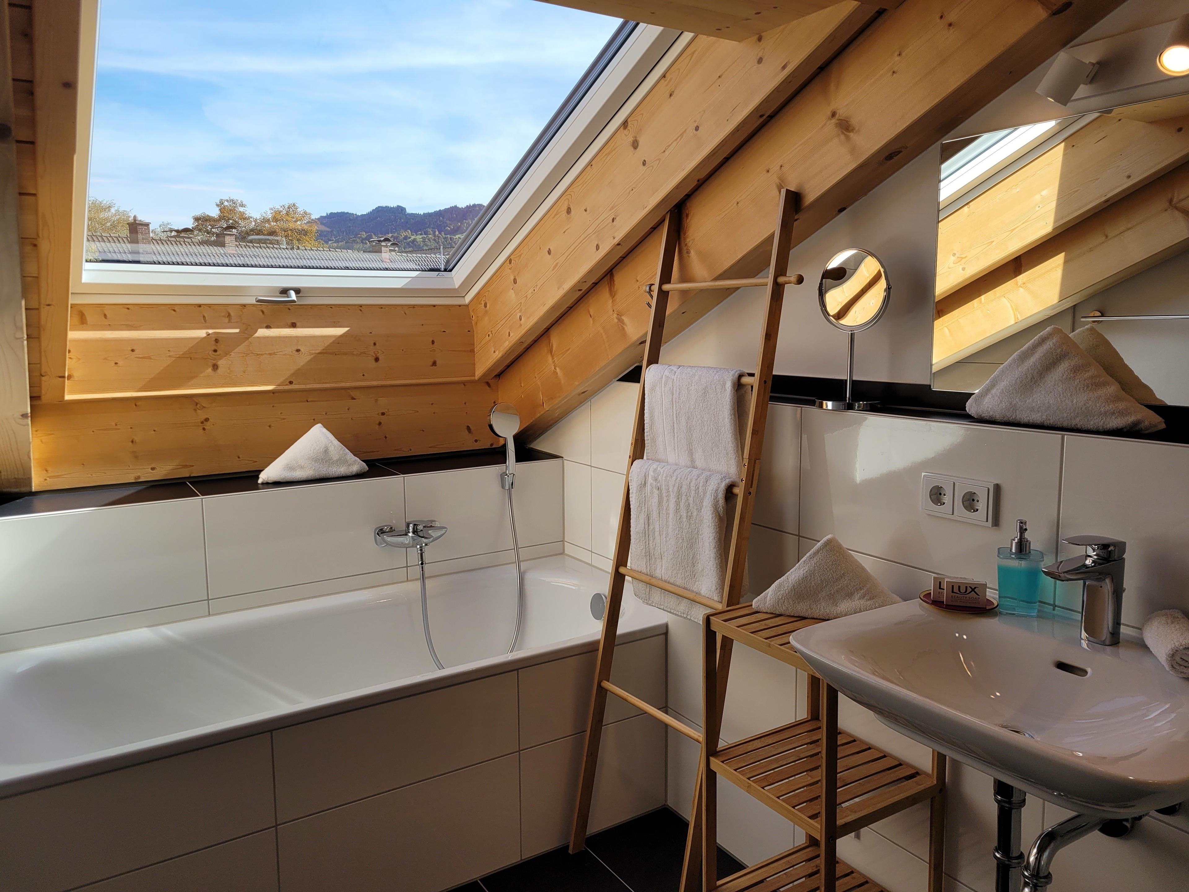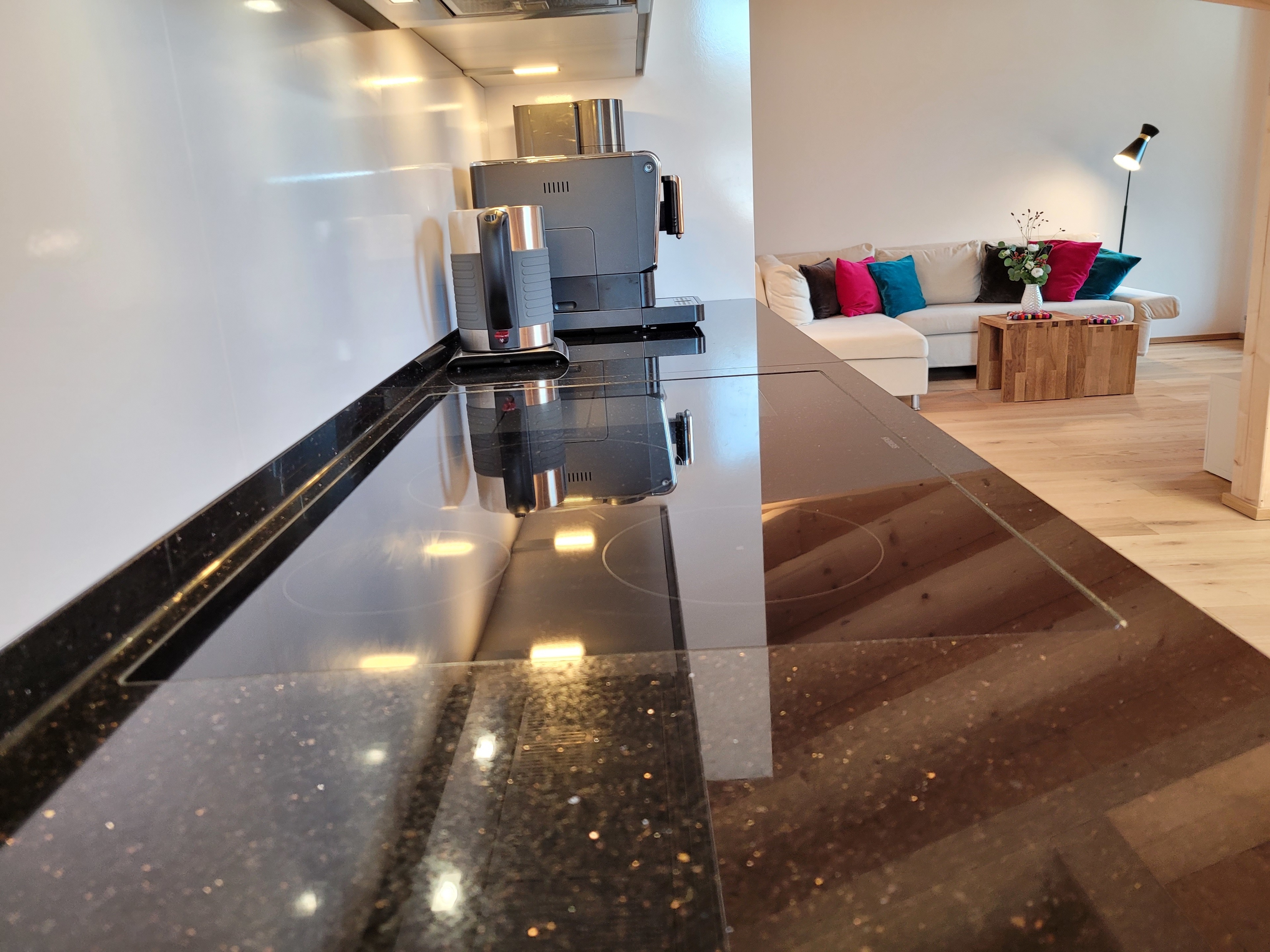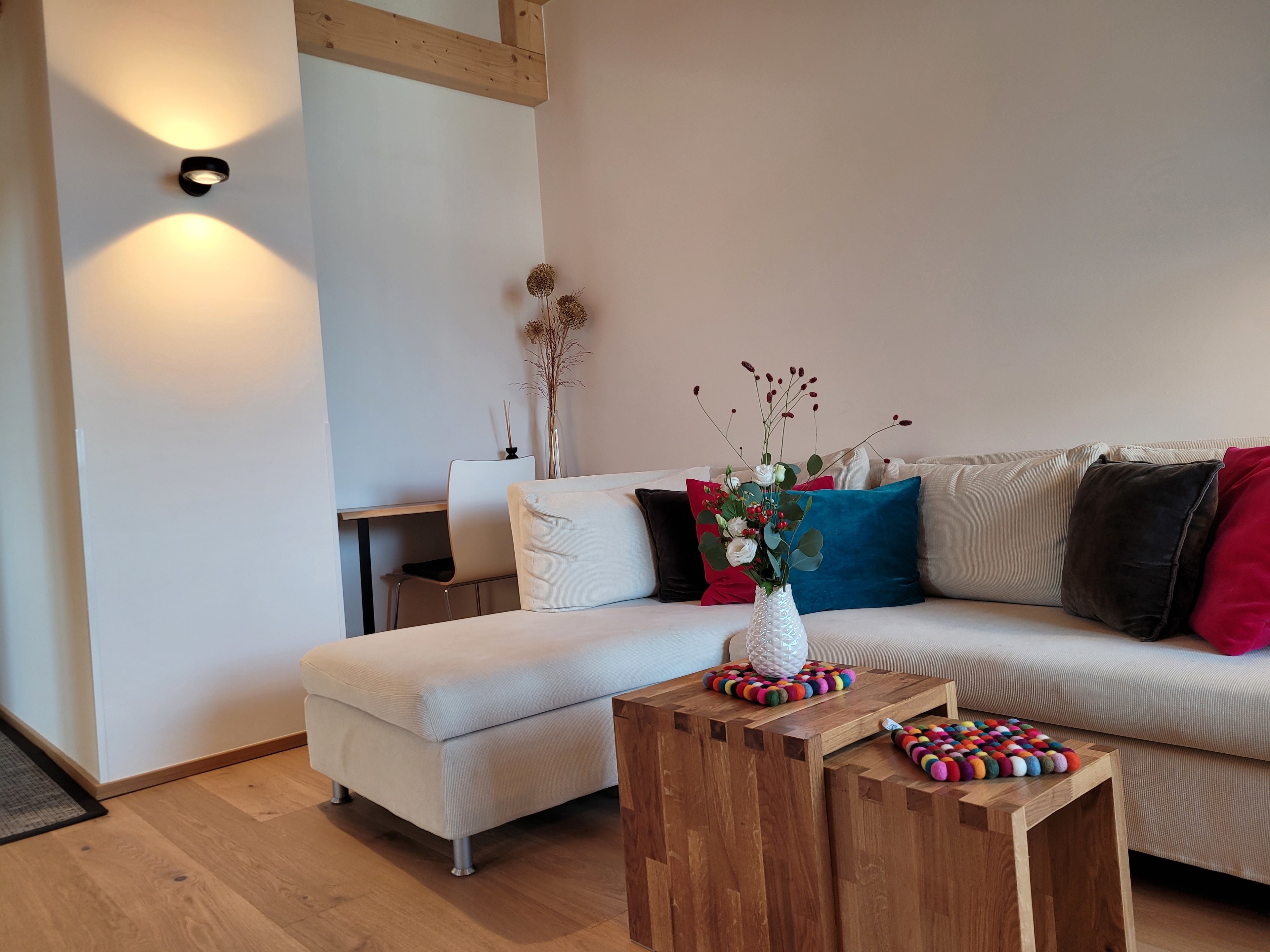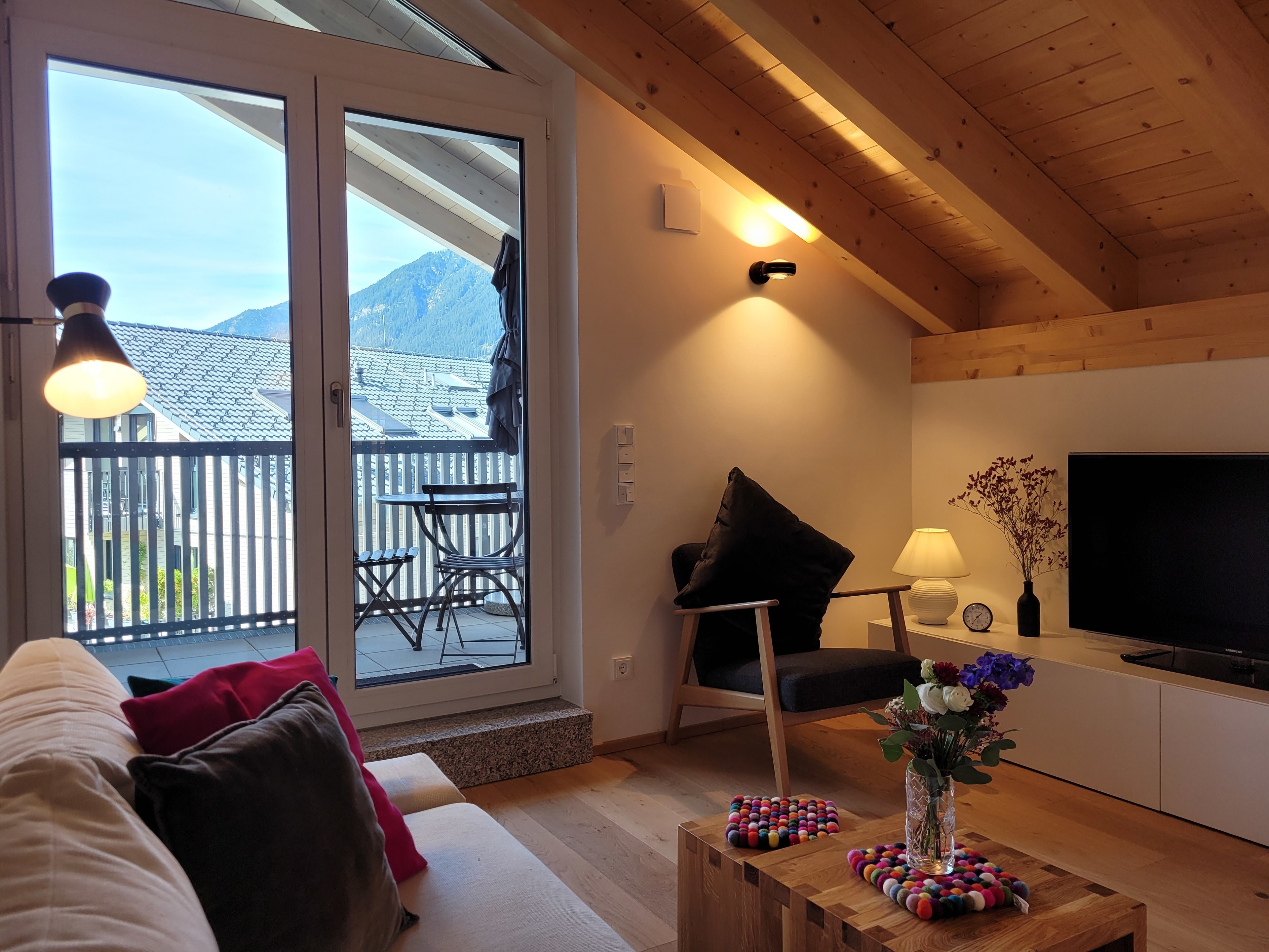 Die qualitativ sehr hochwertig ausgestattete Ferienwohnung bietet angenehmsten Komfort für bis zu 4 Personen. Der hohe offene Dachstuhl, die Dachfenster, die nachhaltigen Eichen Massivholzmöbel und das Eiche-Naturholzparkett mit Fussbodenheizung garantieren eine Wohlfühlgemütlichkeit und strahlen eine alpenländische Atmosphäre aus.