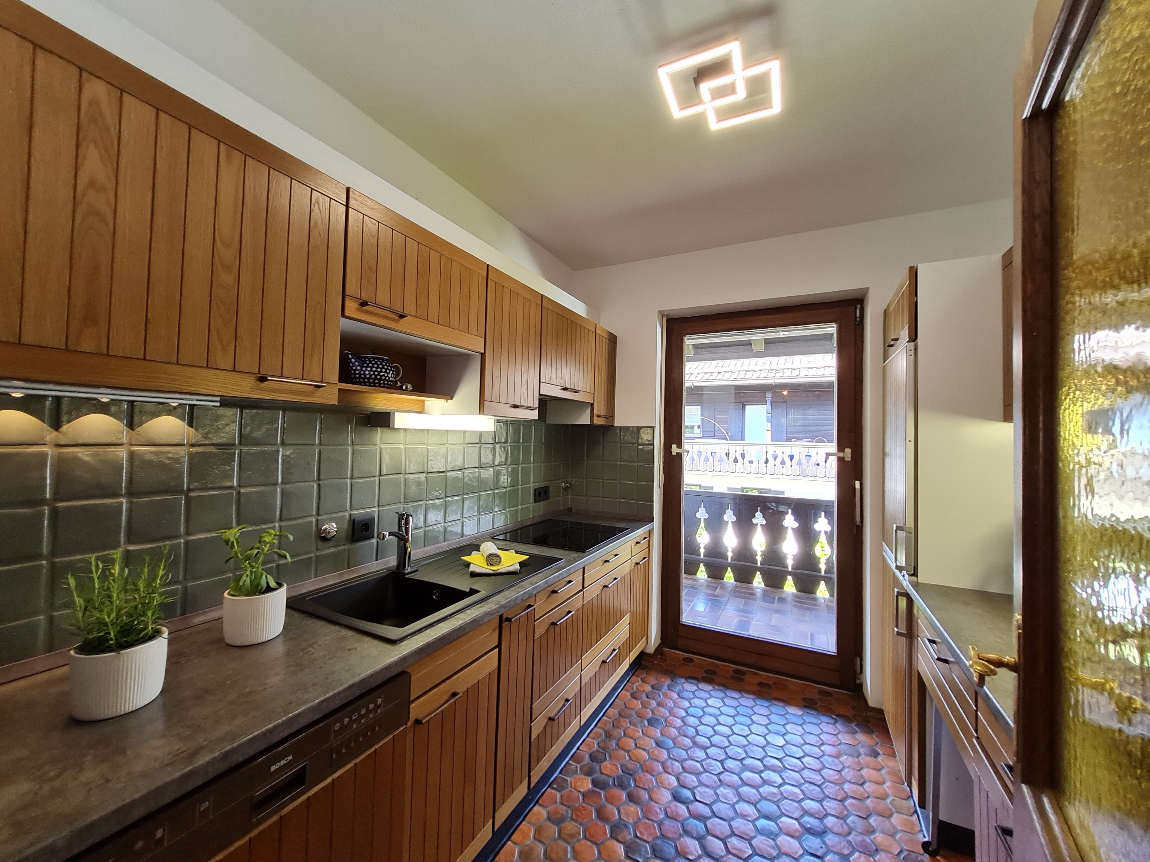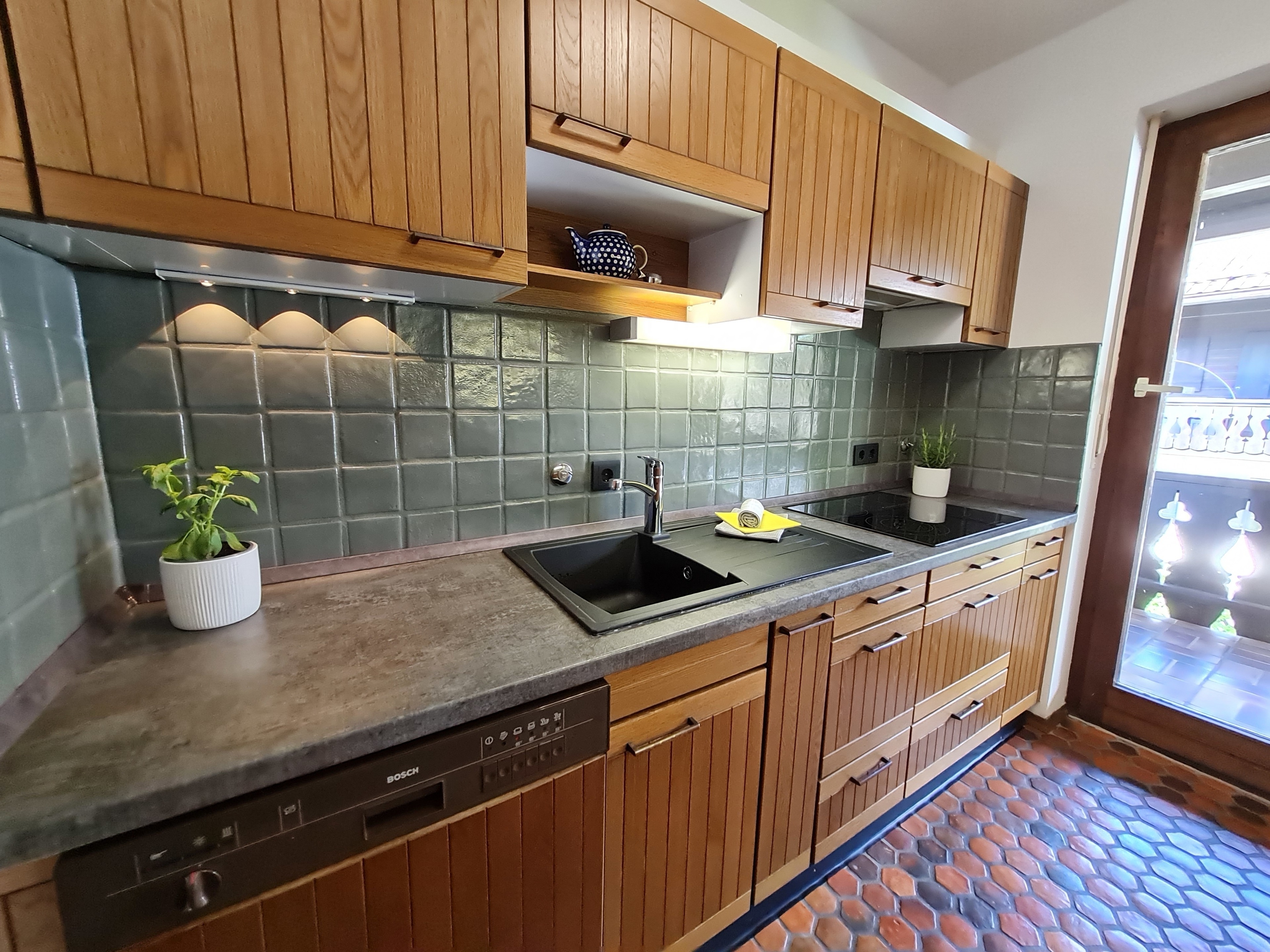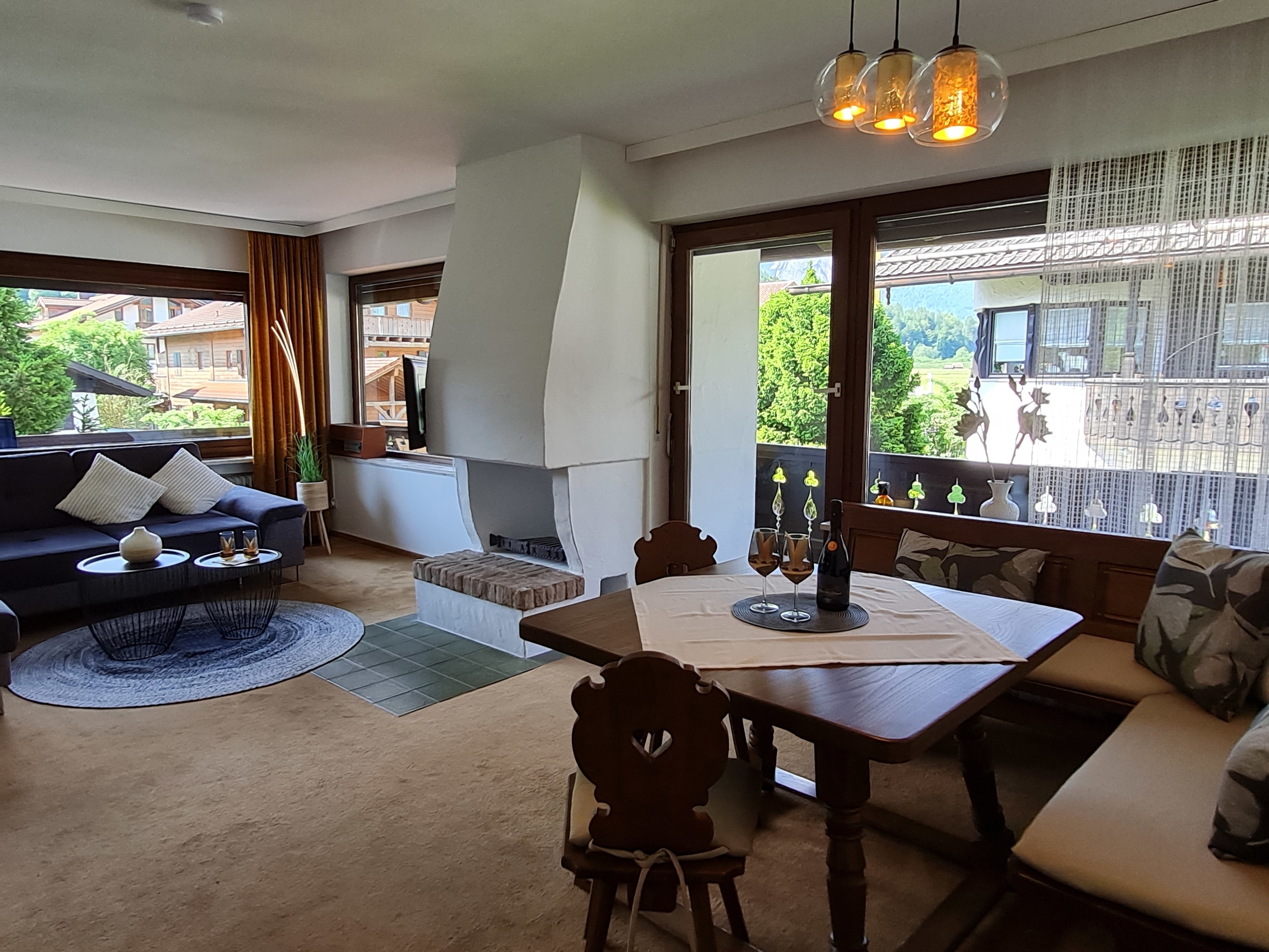Unsere Wohnung „ALPENECK“ befindet sich im 1. Stock eines Mehrfamilienhauses und überzeugt durch eine ruhige Lage, nur 20 Minuten Fußweg vom Ortskern entfernt. Die bayerische Mentalität kommt durch die warmherzige Gestaltung des Essbereichs perfekt zur Geltung: Ein original Bauernschrank kombiniert mit einer gemütlichen Essecke lädt zu gemütlichen Stunden im Kreise der Liebsten ein. Der offene Wohnbereich mit bequemen Sitzmöbeln und TV grenzt direkt an, so dass sich die Familie in lockerer Atmosphäre zur gemeinsamen Abendgestaltung versammeln kann. Das Sofa kann in wenigen Handgriffen zur Schlafcouch gewandelt werden, so dass bis zu 6 Personen ihren Platz in der Wohnung finden können. Die Küche wurde neu gestaltet und bietet allen notwendigen Küchengeräten das perfekte Kochambiente für Ihren Aufenthalt. Natürlich finden Sie dort auch eine Kaffeemaschine und alle unentbehrlichen Kochutensilien.