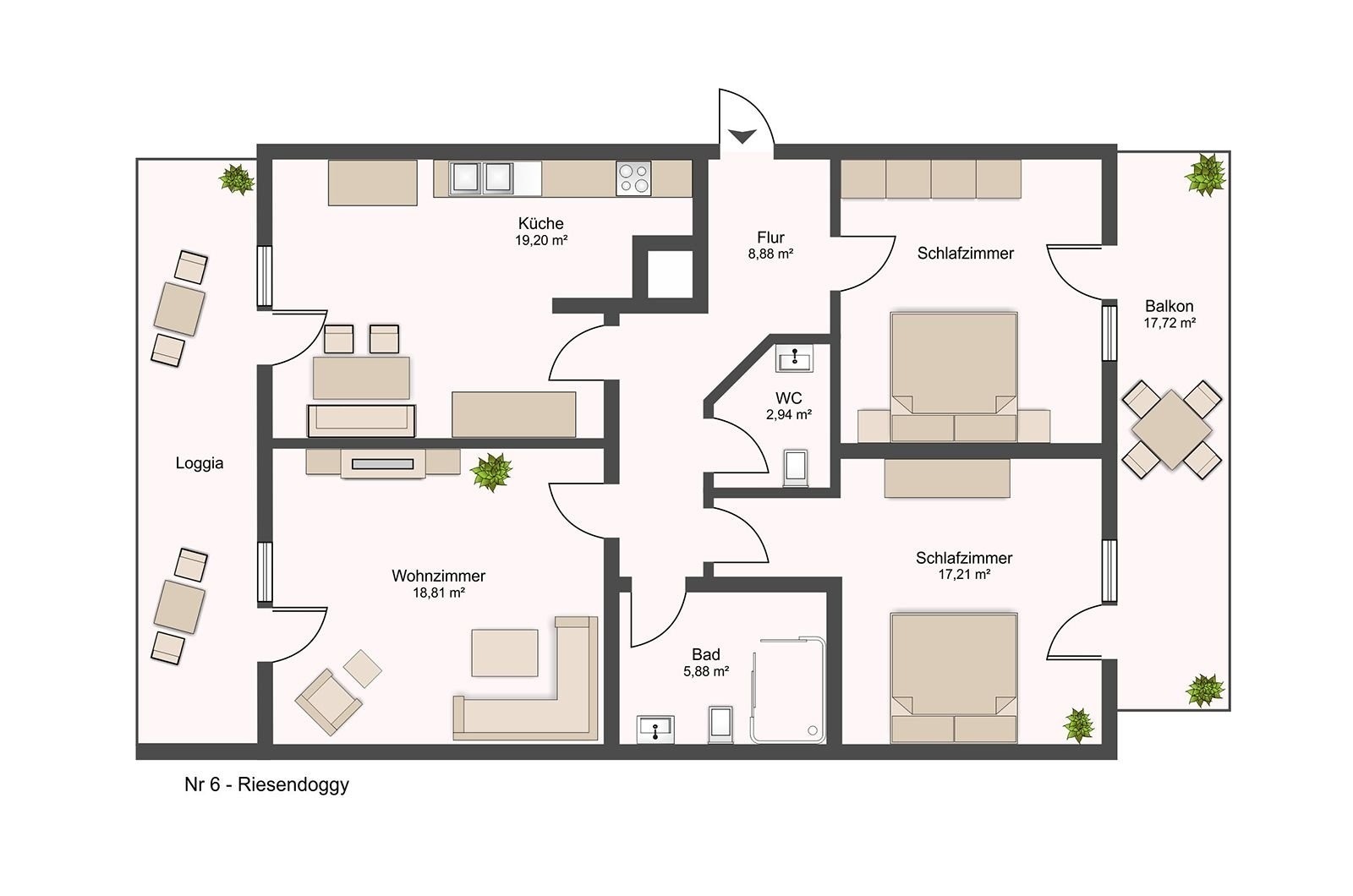 Die große, helle Ferienwohnung Riesendoogy begeistern mit ihren 3 großen Balkonen, von denen Sie einen atemberaubenden Blick haben. Der ca. 20 m² große Südbalkon/Loggia lädt mit seinem Essplatz und der Relax-Lounge zum verweilen ein.