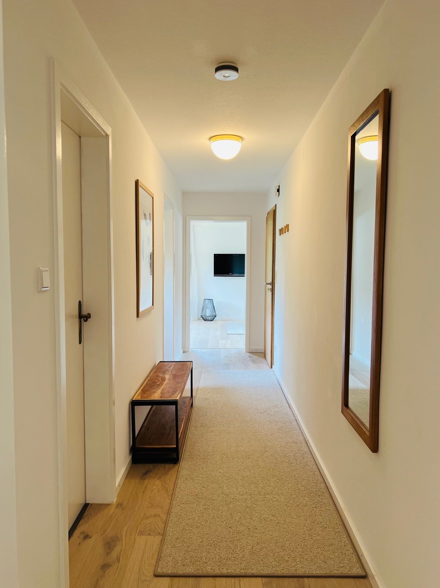 Die Ferienwohnung ist modern eingerichtet, wodurch eine gemütliche und einladende Atmosphäre geschaffen wird. Sie verfügt über alle Annehmlichkeiten, die Sie für einen angenehmen Aufenthalt benötigen. Das Wohnzimmer lädt mit seiner behaglichen Einrichtung zum Entspannen und Wohlfühlen ein. Hier können Sie sich nach einem ereignisreichen Tag einen spannenden Film auf dem Flachbildfernseher anschauen.