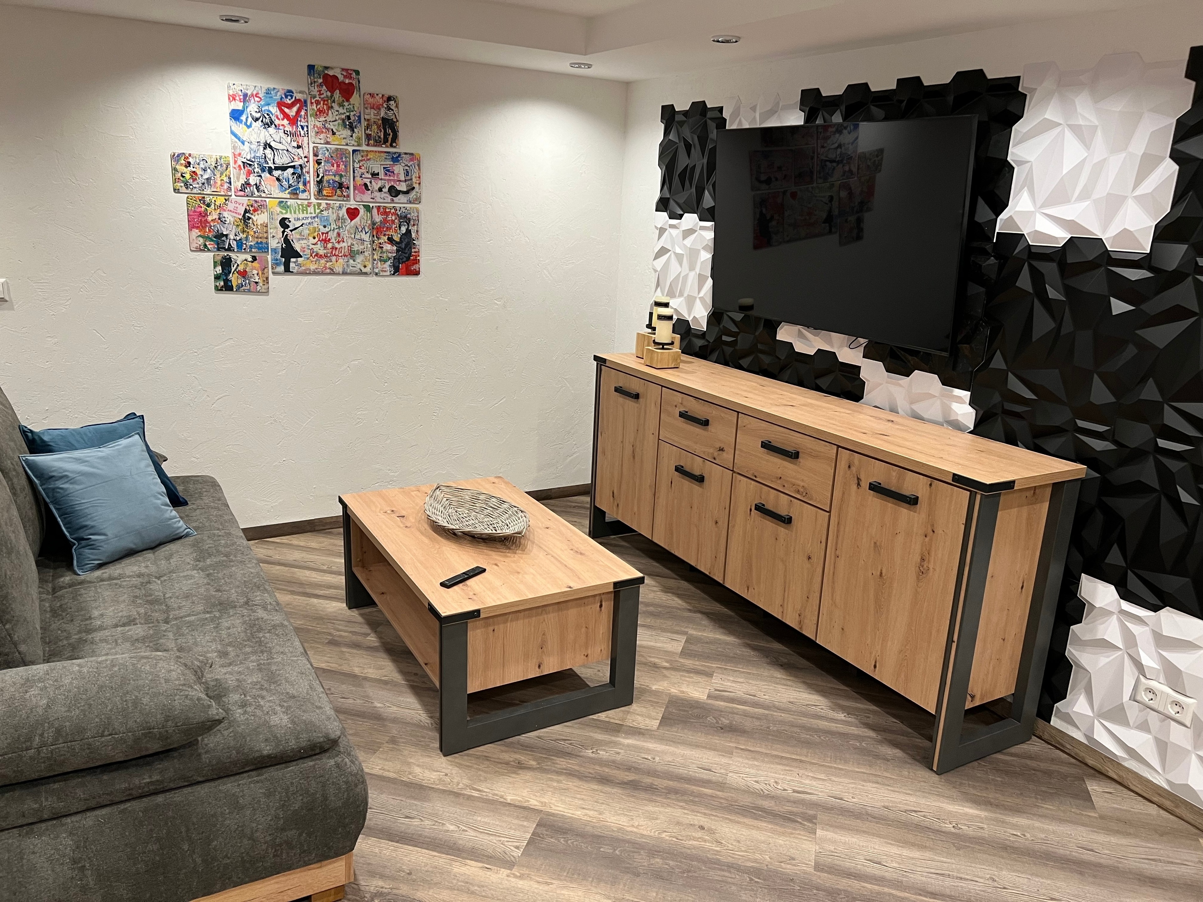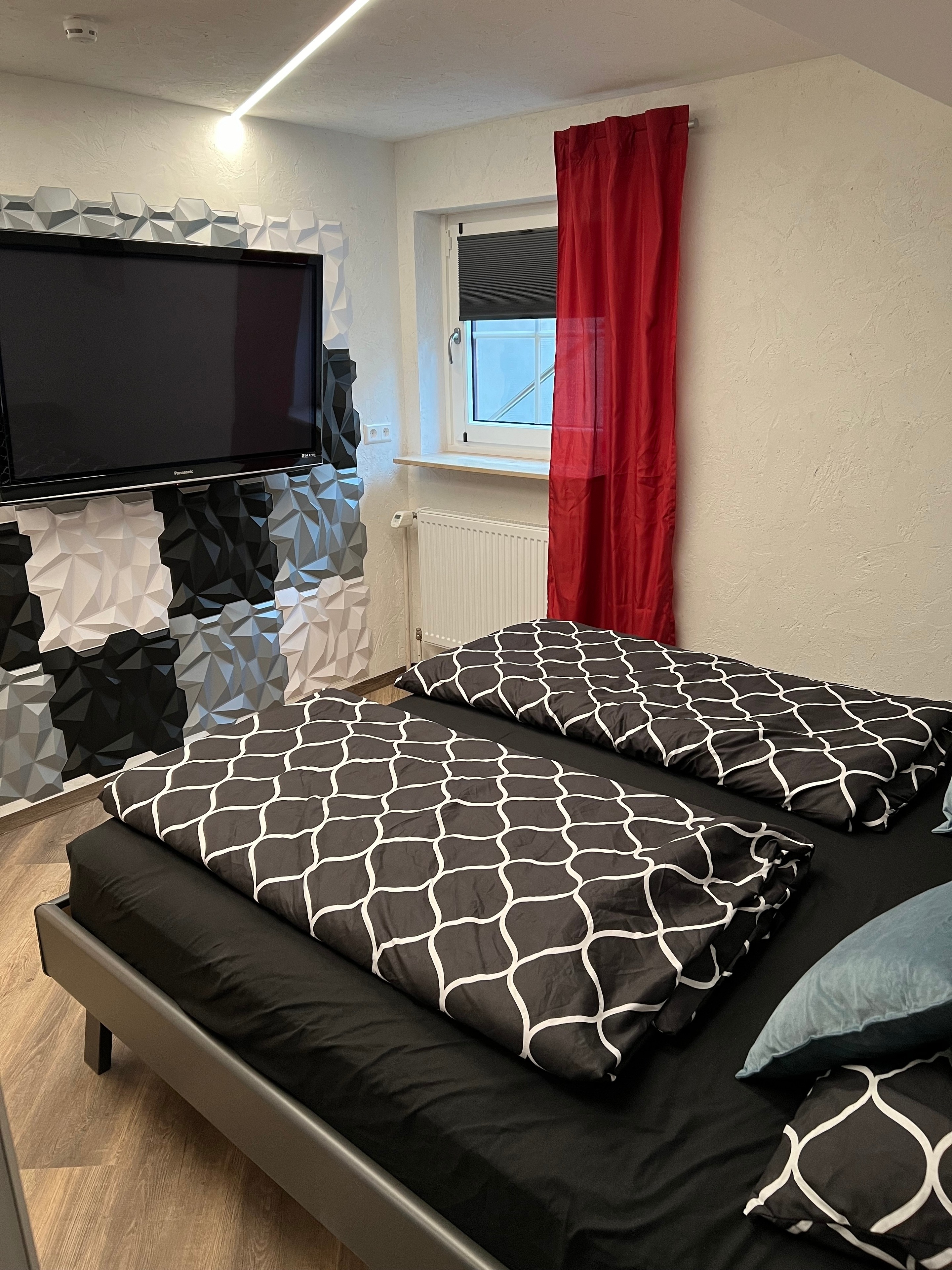 Das Apartment Josha befindet sich in Heilbronn (Teilort 2 km von Feuchtwangen entfernt) Es wurde 2024 komplett neu renoviert und hochwertig ausgestattet. Vom Flur aus geht es ins Schlafzimmer mit einem 180 cm breiten Bett mit Bockspringmatratze, Kleiderschrank und TV. Im zweiten Zimmer befindet sich eine voll ausgestattete Küchenzeile, ein Esstisch für 4 Personen sowie eine Couch (welche auch als Schlafcouch verwendet werden kann) und ein 55 Zoll LED TV.