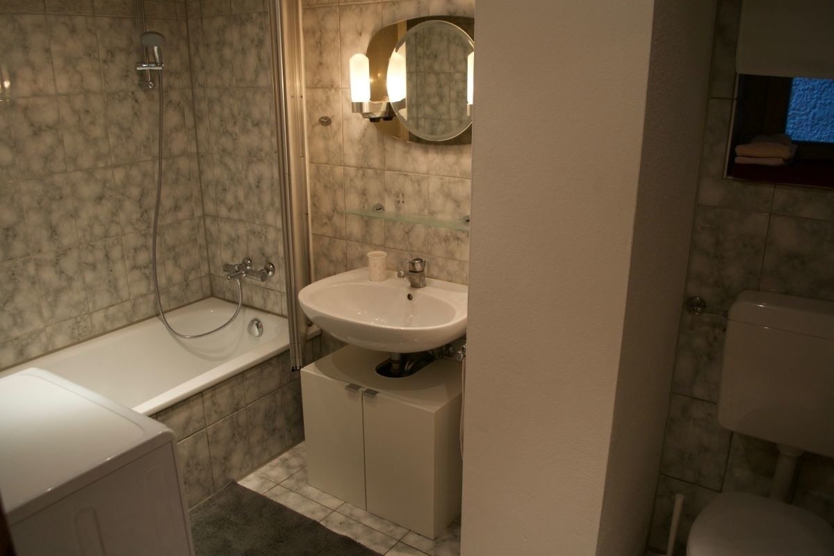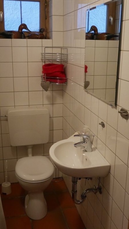 Das Badezimmer verfügt über eine Waschmaschine. Im Erdgeschoss befindet sich zusätzlich ein Gäste-WC.