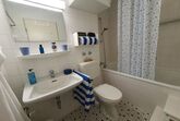 Das Bad ist mit Toilette, Badewanne und Waschbecken ausgestattet.