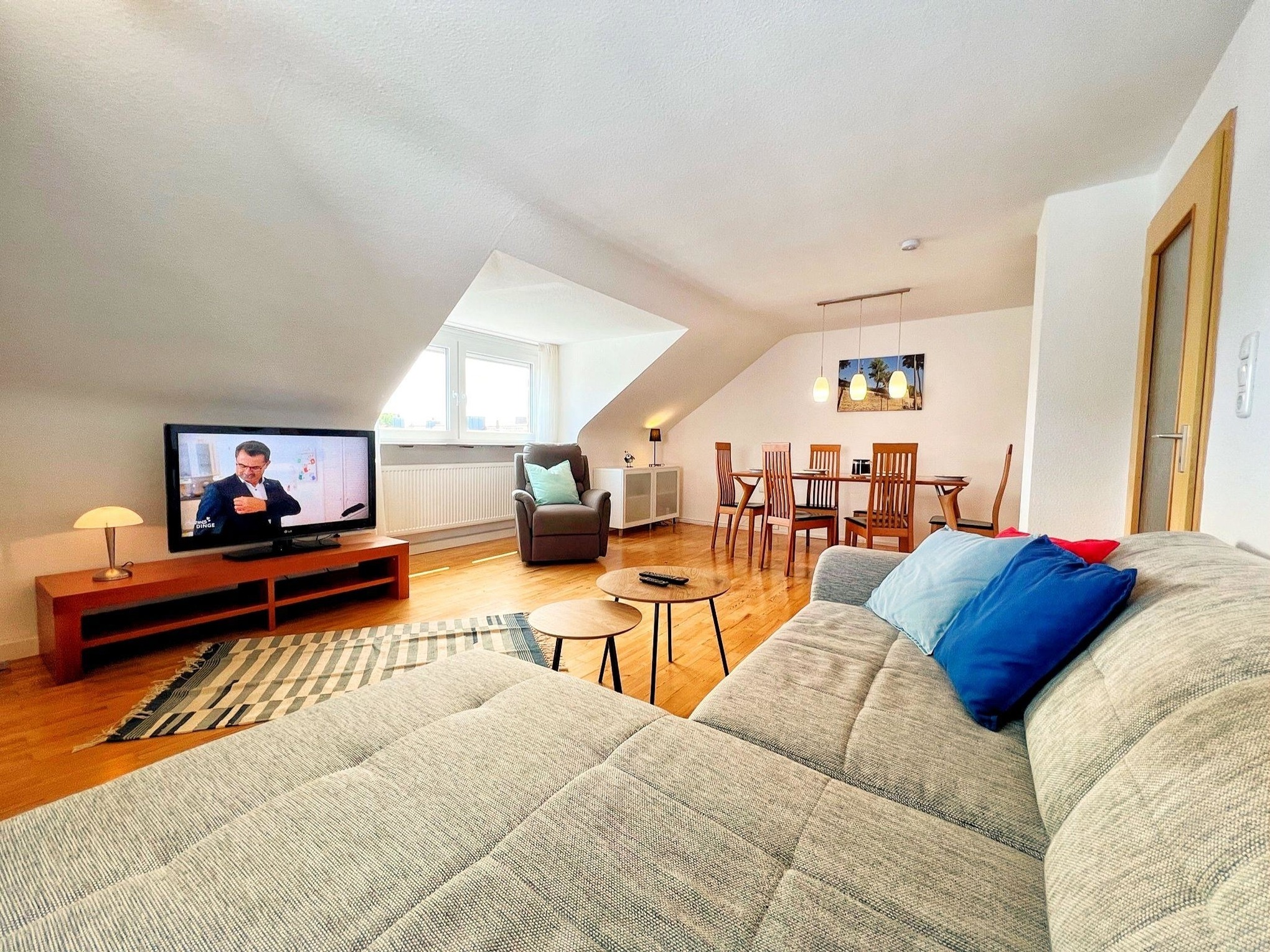 Wohn/Esszimmer mit Schlafcouch, Sessel, TV mit DisneyPlus und Netflix, großer Esstisch mit 6 Stühlen