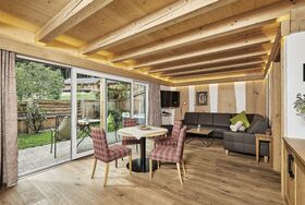 Das Chalet ist ausgestattet mit Wohnraum mit gemütlichem Leder-Sofa, voll ausgestatteter Küche, Zirbenholz-Schlafzimmer, großem Badezimmer mit Sauna und Terrasse oder großem Balkon.