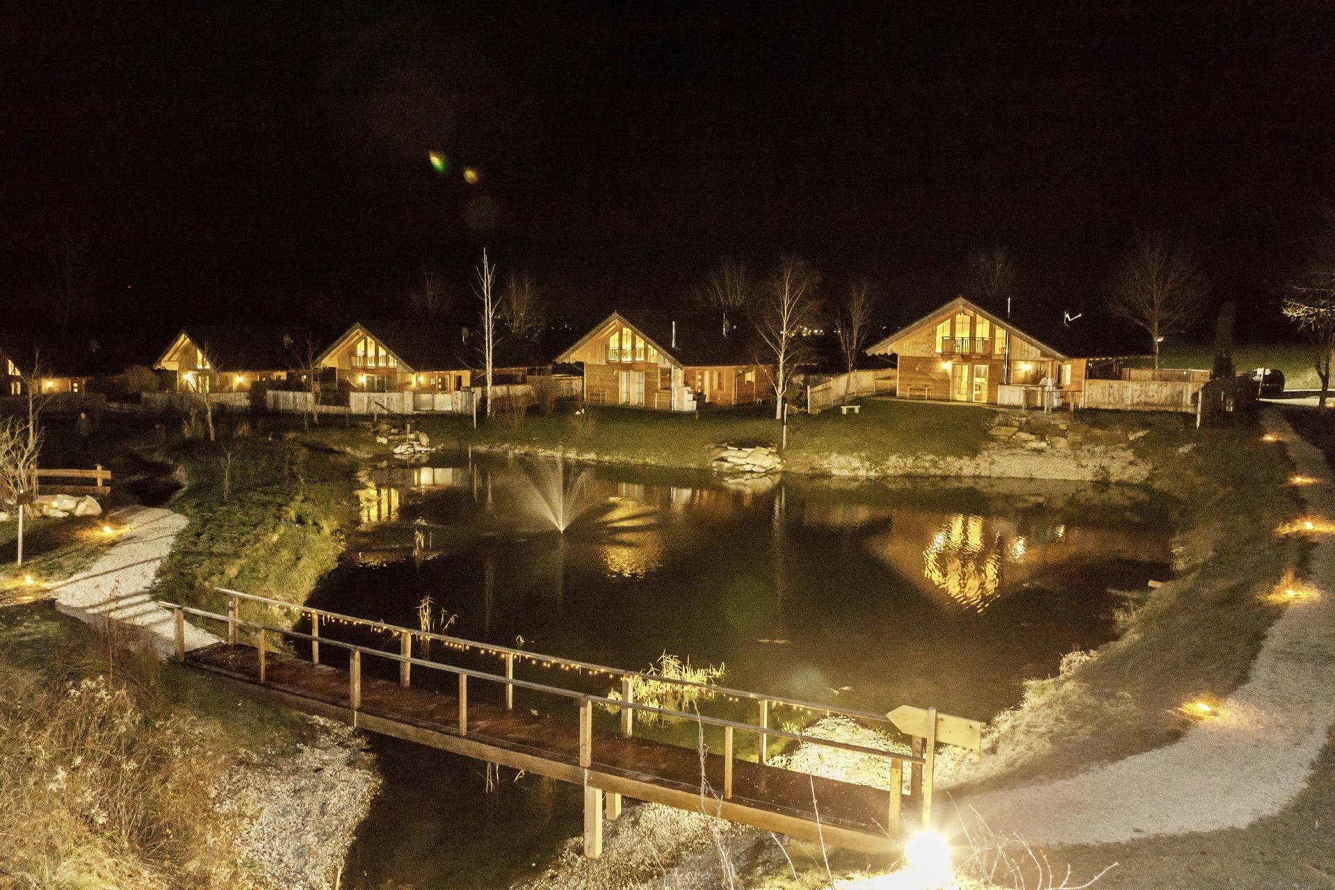 Von den Chalets genießen Sie einen herrlichen Ausblick auf die Bergwelt und auf den kleinen Bayern-Chalet-See.