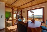 Der Außenbereich bietet einen atemberaubenden Ausblick auf den Garten und die umliegenden Wälder.