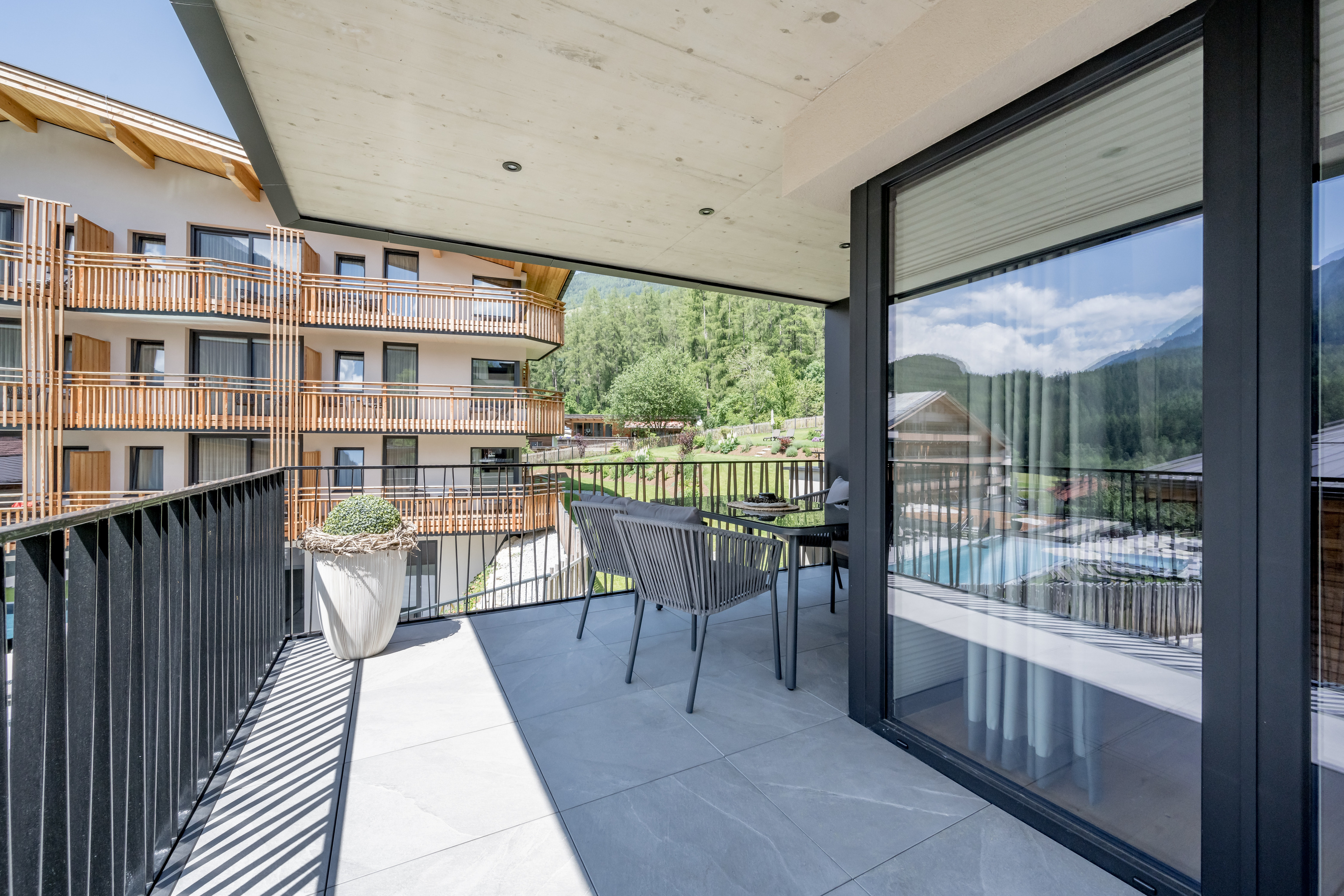 Im Apartment № FIVE entspannen Sie auf einer nach Südwesten ausgerichteten, voll möblierten und überdachten Terrasse.