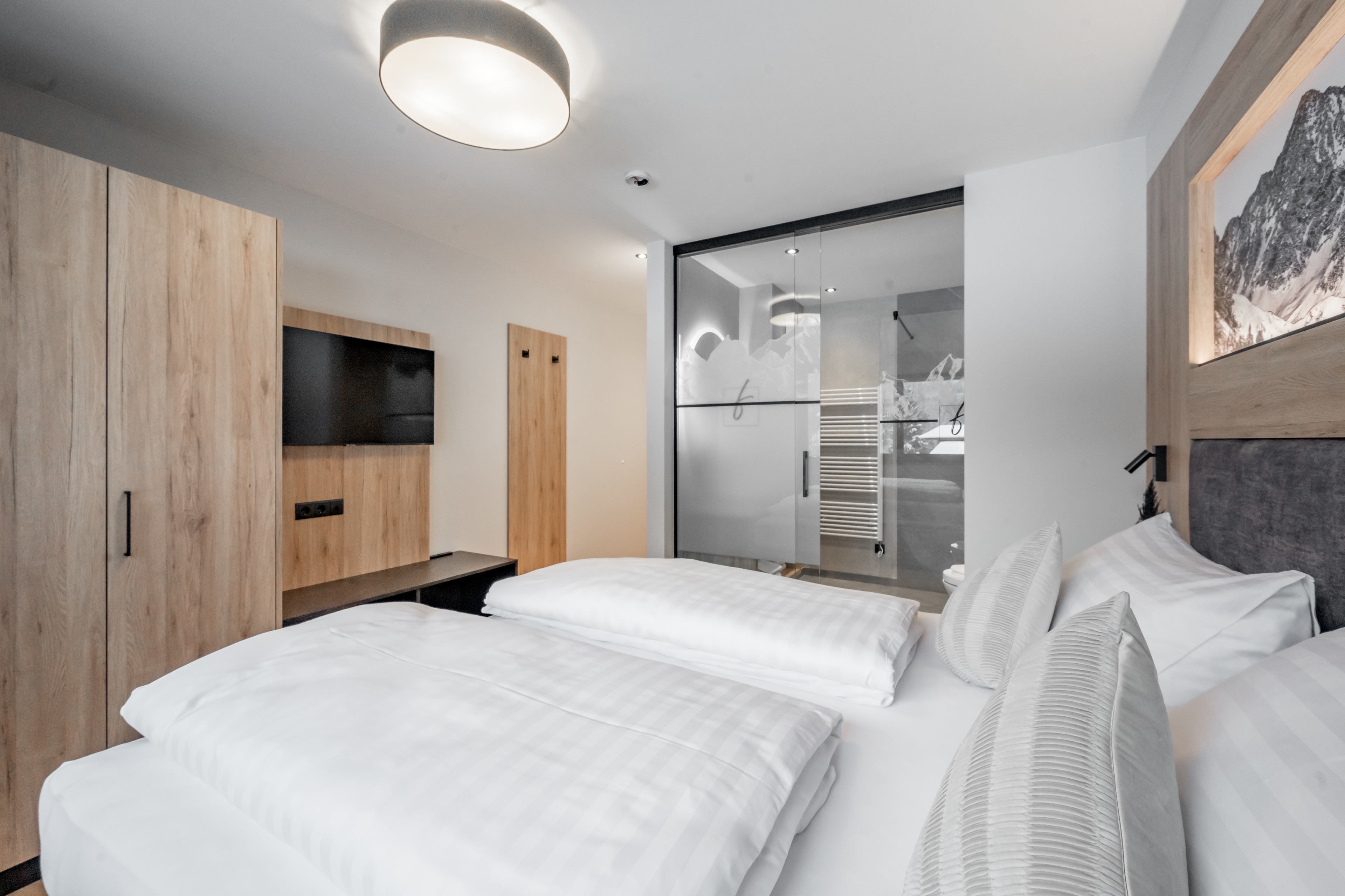 Unsere Apartments № FIVE in Oetz im Ötztal befindet sich im zweiten Obergeschoß und ist einfach über den Personenaufzug zu erreichen. Es begeistert mit sonnigem, offenem Wohn-Ess-Kochbereich und voll ausgestatteter Küche inkl. ausziehbarer Couch und einer direkt an den Wohnbereich angrenzender Zirbenholz-Sauna mit integriertem Infrarotstrahler. Das Apartment bietet zwei Schlafzimmer, eines davon ist ausgestattet mit einem Doppel-Boxspringbett, das zweite mit einem Doppel-Boxspringbett und zusätzlich einem Einzelbett. Die Schlafzimmer verfügen jeweils über ein großzügiges, modernes Badezimmer mit Dusche & WC.