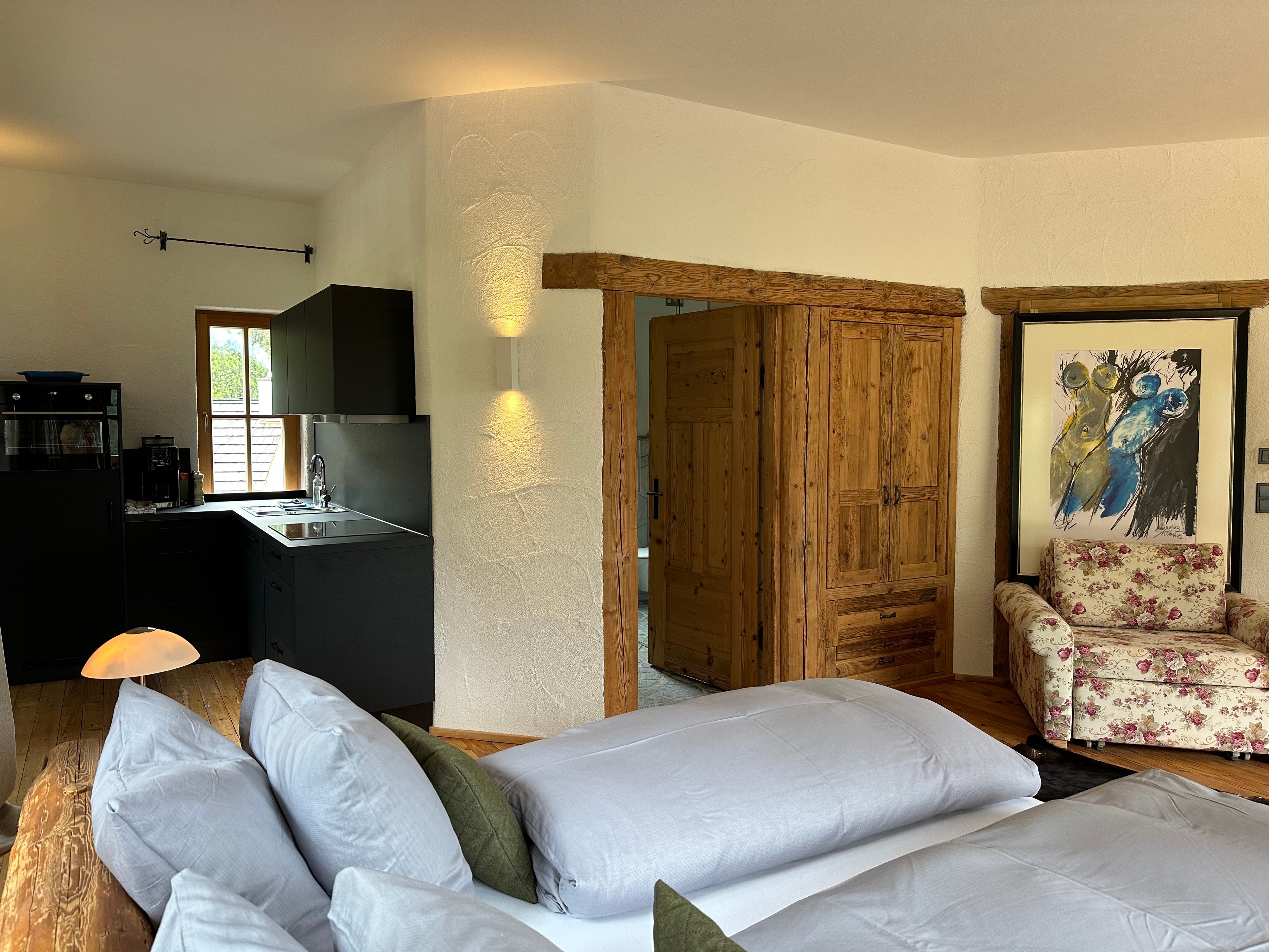 Das Studio befindet sich im ersten Stock und ist über eine leicht steile Außen-Wendeltreppe über die Balkonterrasse erreichbar. Leider ist es nicht barrierefrei zugänglich.