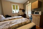 Wir bieten in unserem Studio DAVINCI am Schloss Wald in der Perschlingtalstr. 35, 3144 Pyhra-Wald ein Einzimmer-Apartment mit 2 Boxspring-Einzelbetten (90 x 200 cm) an, welche einfach und bequem zu einem Kingsize-Bett von 180 x 200 cm zusammengeschoben werden kann (ohne Besucherritze).