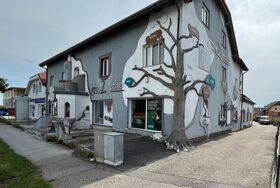 Die Anlage ist von außen sofort erkennbar durch die eigenwillige Fassadengestaltung, dessen eine Hausecke ein riesengroßer Baum ziert.