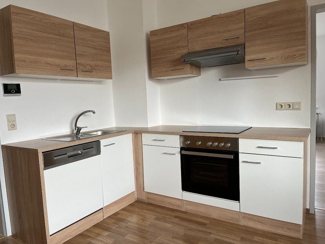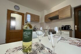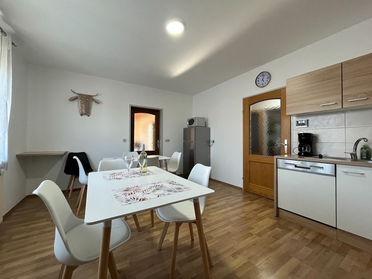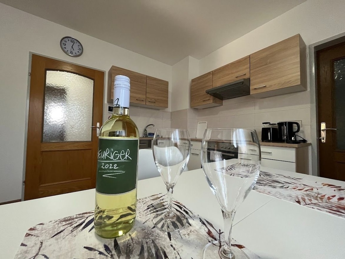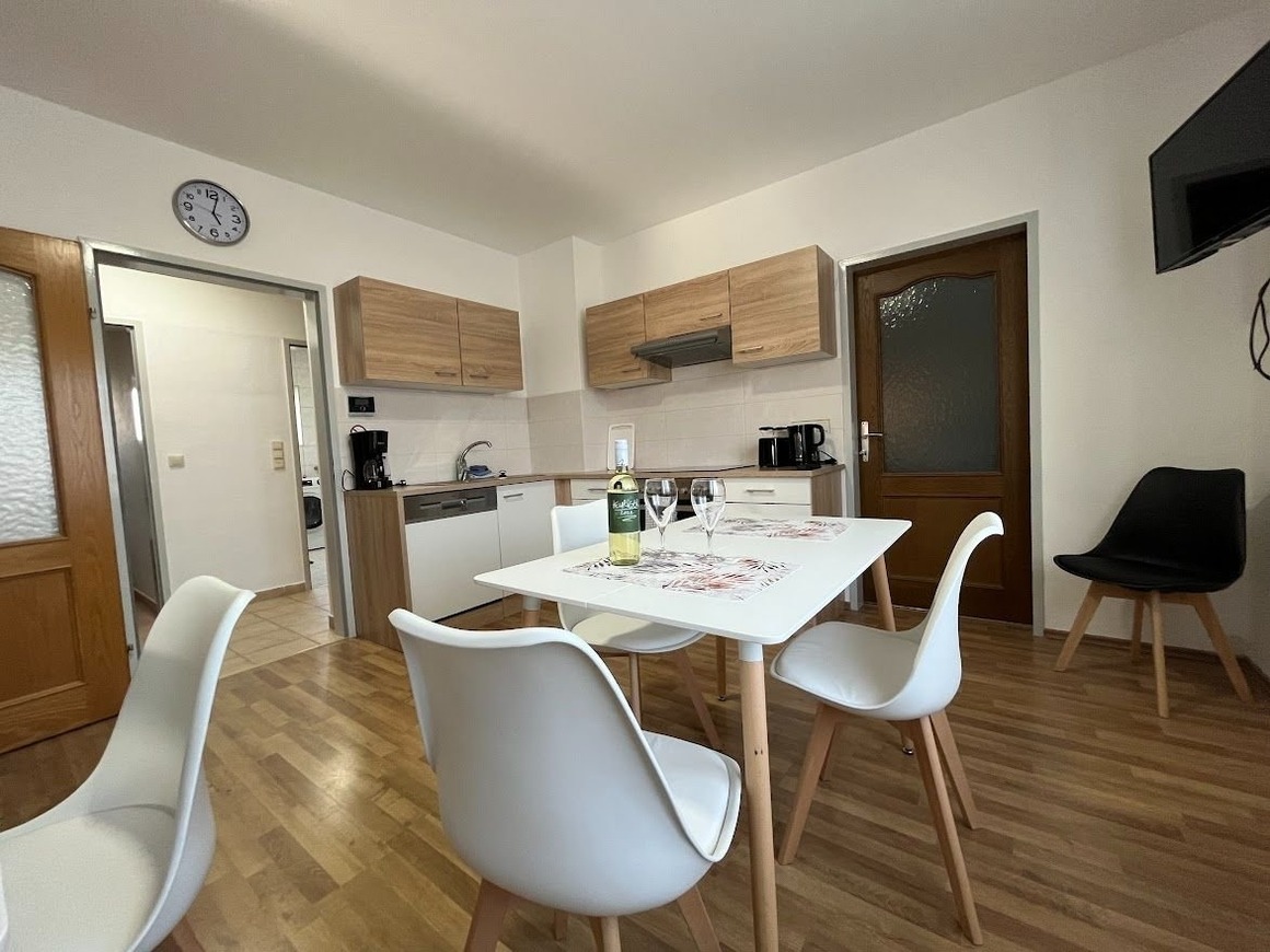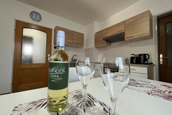Das Apartment ist ausgestattet mit kompletter Küche, Herd, Backofen, Mikrowelle, Kühlschrank mit Gefrierfach, Geschirrspüler und Waschmaschine (10 kg).