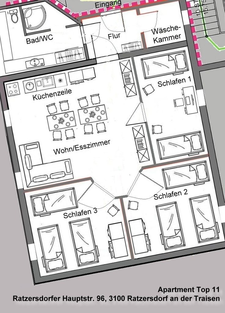 An der Adresse Ratzersdorfer Hauptstr. 96, 3100 St. Pölten steht Ihnen in der Geschäfts- und Wohnanlage dieses wunderschön eingerichtete Apartment Top 11 zur Verfügung.