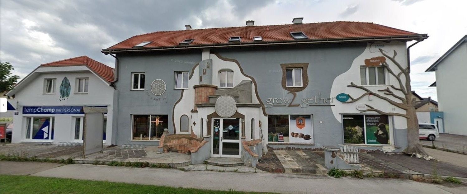 Die Anlage ist von außen sofort erkennbar durch die eigenwillige Fassadengestaltung, dessen eine Hausecke ein riesengroßer Baum ziert.