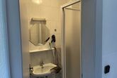 Dusche, WC und separates Waschbecken im Schlafzimmer.