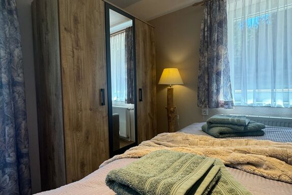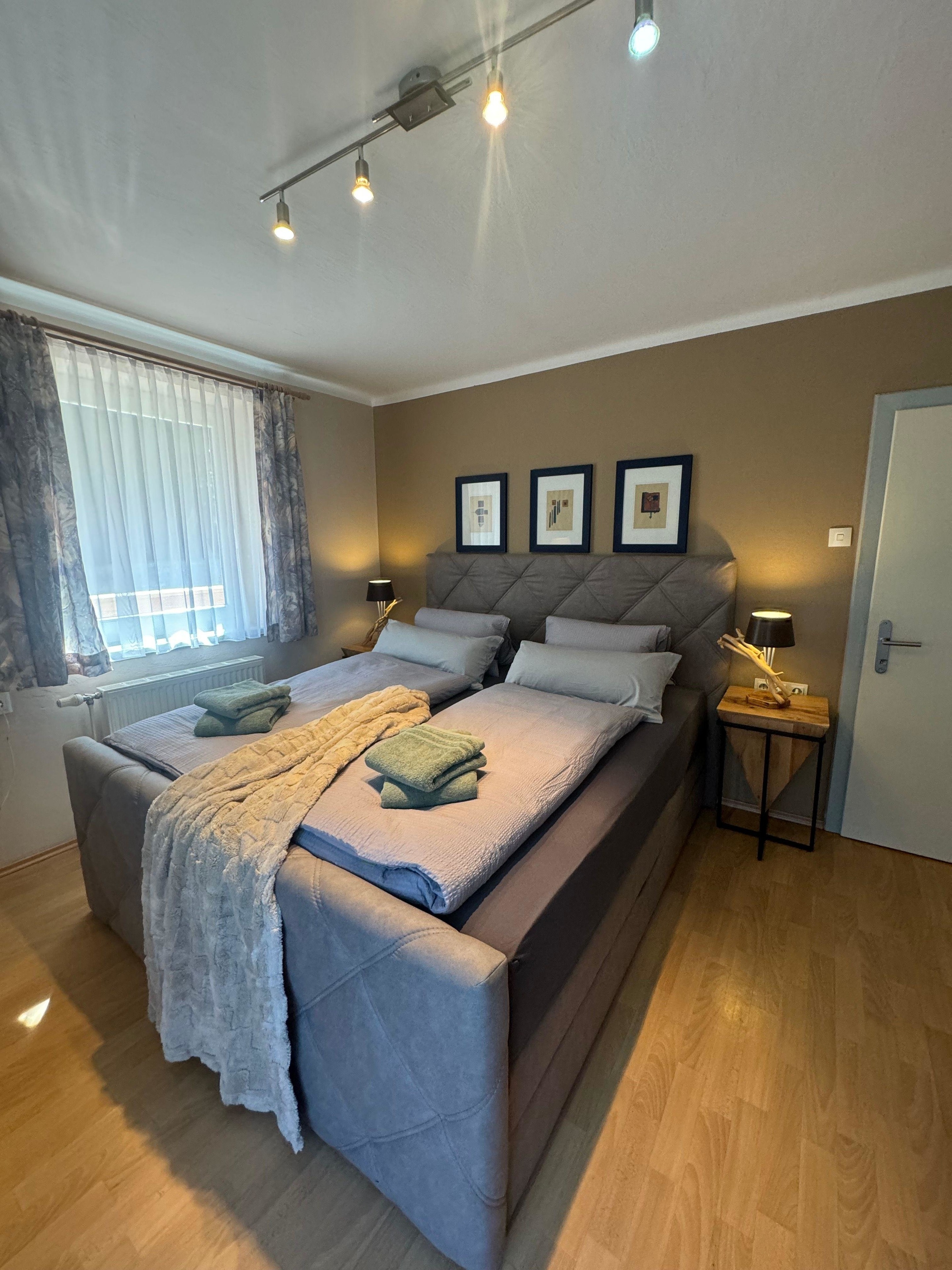 Die modern eingerichtete Ferienwohnung verfügt über ein Schlafzimmer mit 3 Betten (Doppelbett und Einzelbett) und ein Schlafzimmer mit einem Boxspringbett und einem Kinderbett.