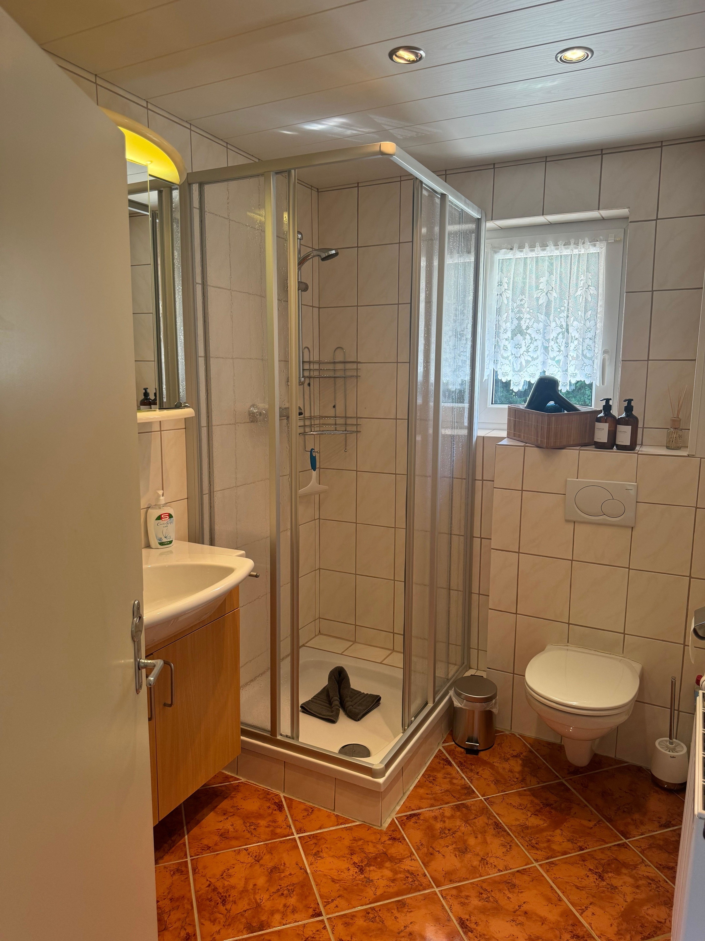 Freuen Sie sich über ein Badezimmer mit Dusche, Waschbecken und WC.