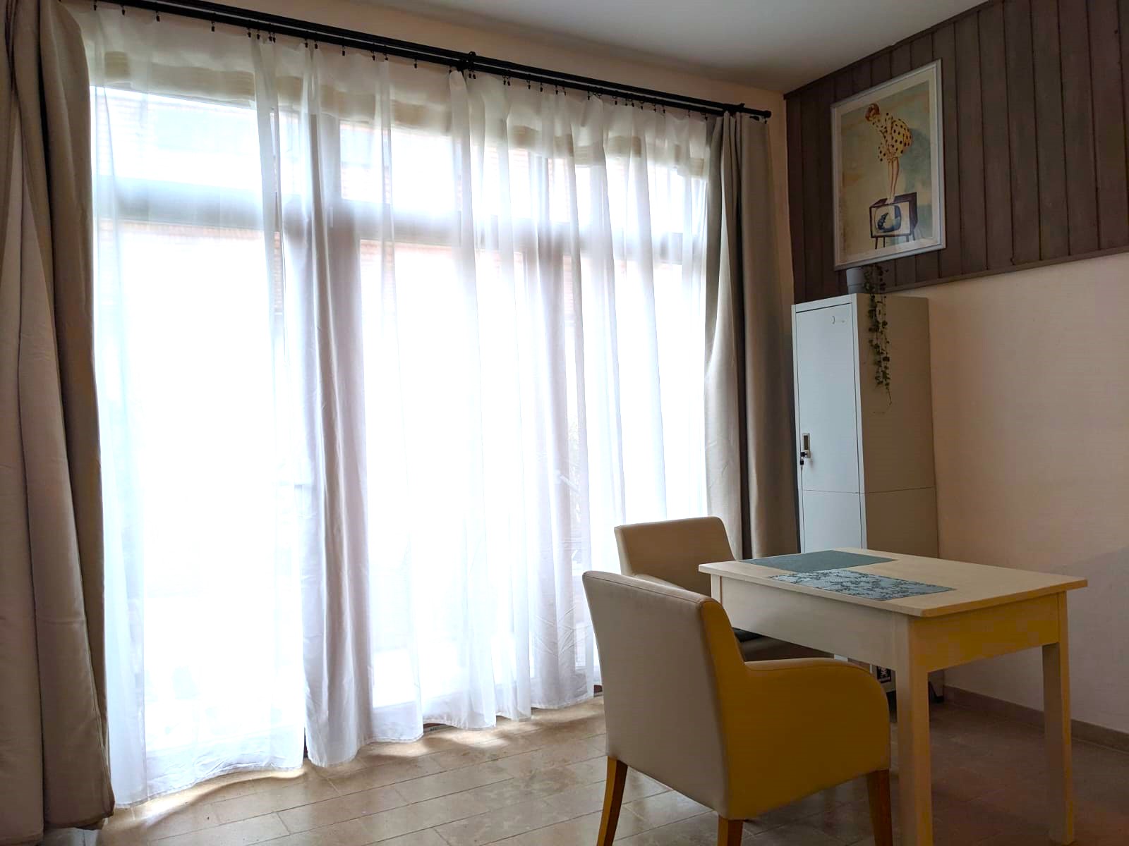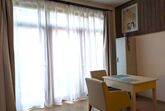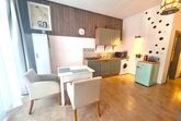 Die Küche ist voll ausgestattet und durch die große Fensterfront ist das Apartment hell und man hat direkten Blick auf die zugehörige Terasse.