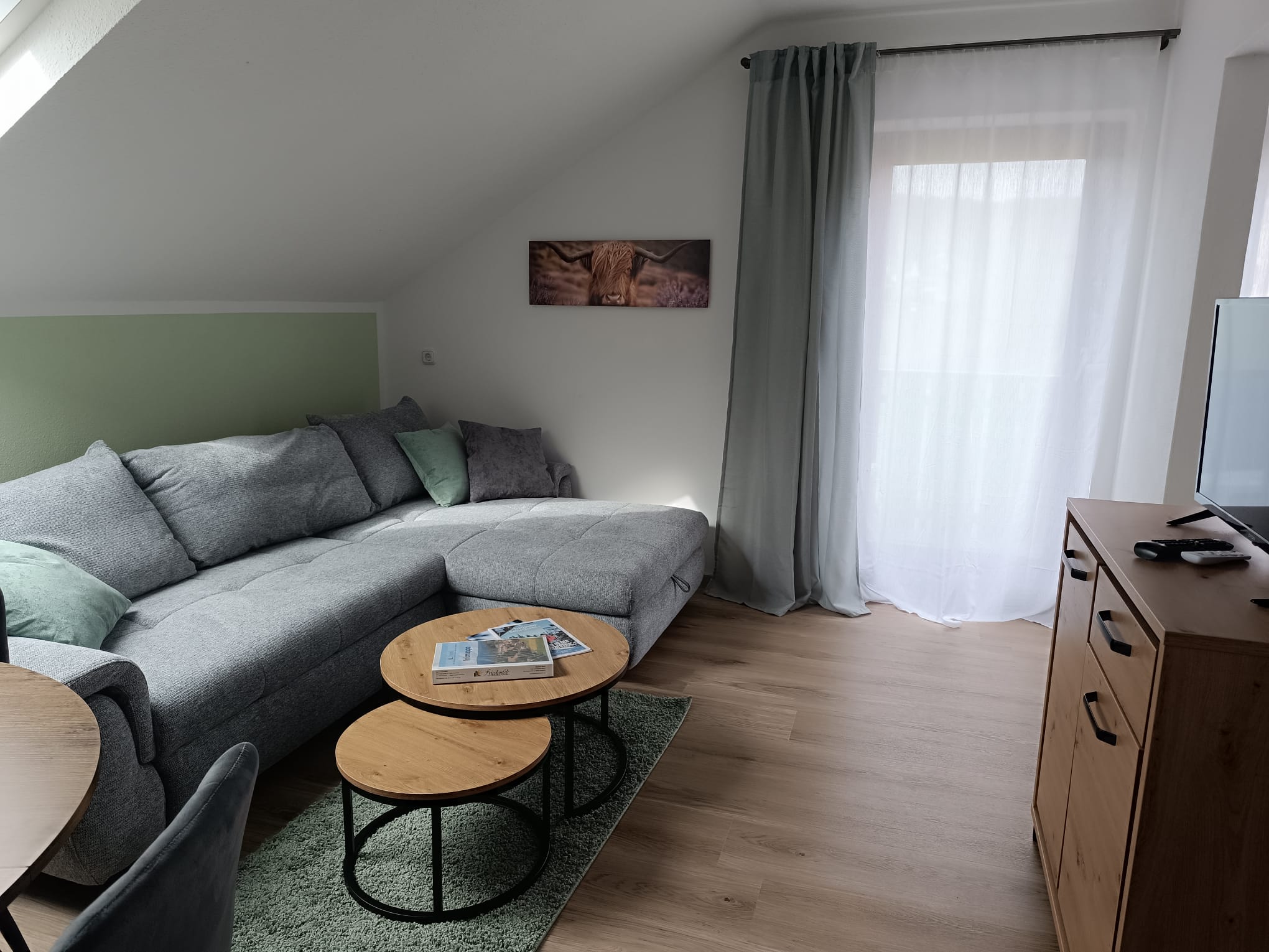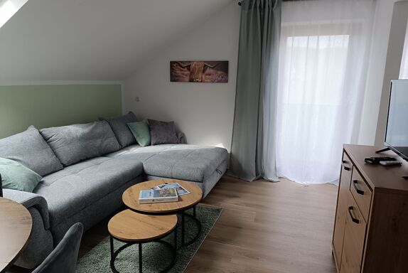 Unsere gemütlich eingerichtete Ferienwohnung mit 42 m² Wohnfläche befindet sich im 1.Stock und bietet Platz für 2 Personen. Die komplett ausgestattete Küchennische mit Kühlschrank, Herd, Backofen, Wasserkocher, Toaster, Kaffeemaschine und einer Grundausstattung an Geschirr, Gläser und Besteck lässt keine Wünsche offen. Im Wohnbereich befindet sich ein Esstisch, eine Couch und ein TV mit SAT-Empfang und Zugang zum Balkon mit einem herrlichen Blick auf den Ortskern. Die Ferienwohnung verfügt über ein Schlafzimmer mit einem Doppelbett. Im Badezimmer befindet sich eine Dusche und ein WC. Bettwäsche, Handtücher, kostenfreie WLAN-Nutzung, Parkplatz und Endreinigung sind im Preis enthalten. Bitte beachten Sie, dass Haustiere nur nach Absprache erlaubt sind.