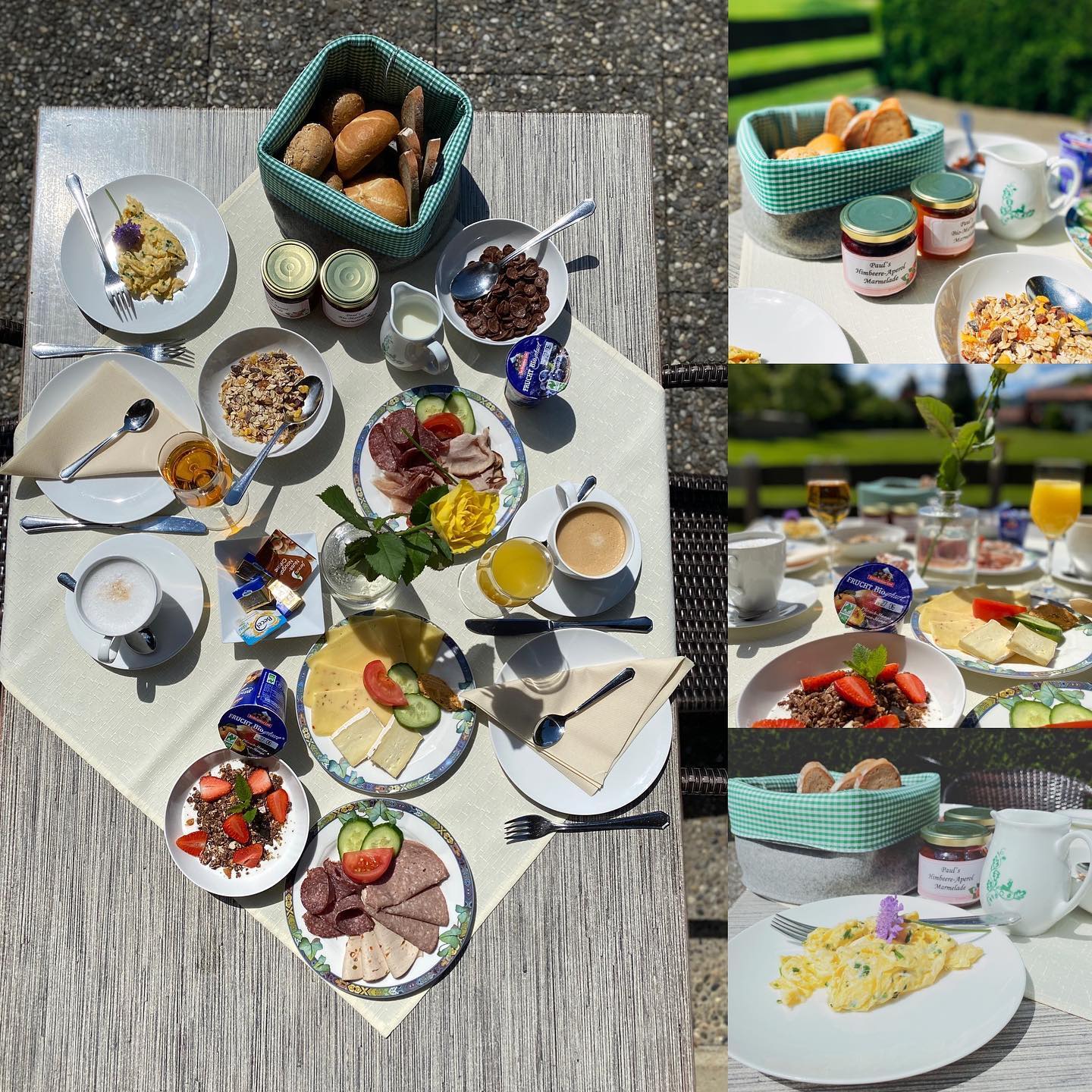 Wir bieten dafür unseren Frühstückskorb „Chiemgau“ an, den Sie sich neben einem Basisfrühstück (Butter, 2 Semmeln pro Person, Marmelade, Honig von lokalen Imkern, Nutella, 1 Heißgetränk, 1 Glas Orangensaft 0,25l) individuell selbst mit verschiedenen Getränken und Essen zusammenstellen und erweitern können.