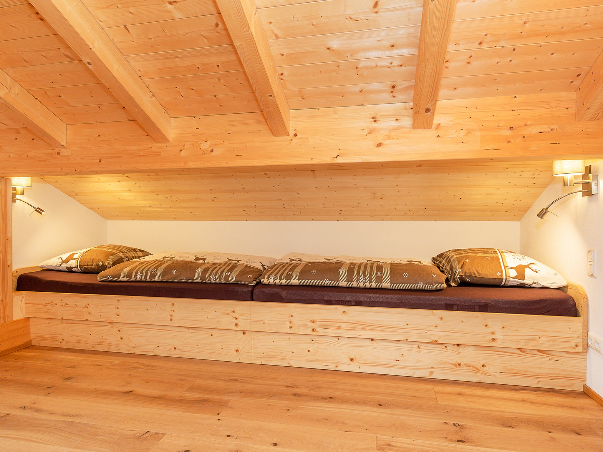 Die Ferienwohnung ist mit einer Infrarot Sauna, einer Badewanne, 2 hochwertigen Bädern, 2 Schlafzimmer (1 Zirbenholz Schlafzimmer mit Doppelbett, 1 Kernbuchen Schlafzimmer mit drei Einzelbetten), moderner, hochwertiger Küchen/Ess- und Wohnbereich mit Schlafcouch ausgestattet.