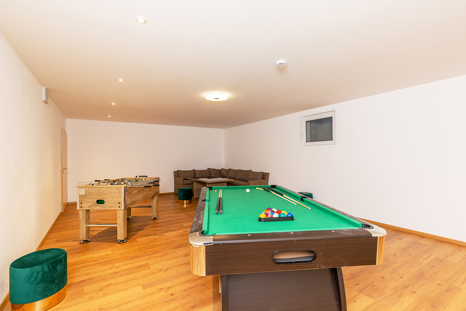 Im Keller wartet auf Sie ein 40 m2 großer Freizeitraum wo Sie Billard, Kickern oder Dart spielen können, natürlich auch mit einem gemütlichen Sitzbereich zum beisammensitzen.