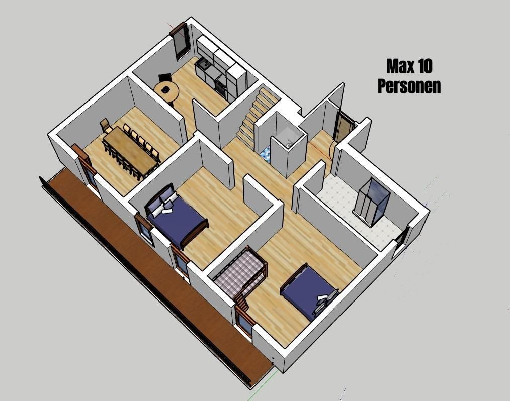 Auf der 2. Stock befinden sich die Halle, Küche mit Sitzecke, Esszimmer, 1 Doppelzimmer, 1 Vierbettzimmer und ein großes Badezimmer. Auf der 3. Stock befinden sich 2 weitere Schlafzimmer für 2 und 4 Personen und eine separate Dusche und Toilette. Das Apartment ist sehr gut für eine größere Gruppe oder mehrere Familien geeignet. Bei Ihrer Ankunft sind die Betten gemacht und es liegen Handtücher für Sie bereit.