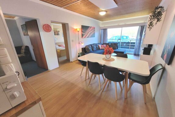 Ihre Ferienwohnung erstreckt sich über 1 Etage, 3 Zimmer (davon 2 Schlafzimmer), ist 60 qm groß und ist für maximal 8 Personen geeignet. An kälteren Tagen kann Ihre Ferienwohnung beheizt werden mit einer Elektroheizung und Zentralheizung. Das Rauchen ist in Innenräumen nicht gestattet. Der Eingang ist im Erdgeschoss und ebenerdig und führt direkt in den Vorraum mit Garderobe. Die Zimmer teilen sich wie folgt auf: Wohn/Schlafzimmer als Durchgangszimmer, 20 qm groß und mit 1 Zusatzbett auf Couch/Sofa, Sitzecke, Essecke, TV, Radio, CD und zur Nordseite. Die Zusatzbetten sind Doppelcouches. Die Essecke bietet Platz für 8 Personen. Sie haben Zugang zum Balkon. Schlafzimmer 10 qm groß und mit 1 Doppelbett. Sie haben Zugang zum Balkon. Schlafzimmer 15 qm groß und mit 1 Doppelbett und 1 Zusatzbett auf Couch/Sofa. Sie haben Zugang zum Balkon. Kochecke im Wohn/Schlafzimmer als Durchgangszimmer und mit TV, Elektroherd (4 Platten), Dunstabzugshaube, Kühlschrank, Mikrowelle, Kaffeemaschine, Toaster und elektrischem Wasserkocher. Bad mit Badewanne mit Duscheinrichtung, 1 Waschbecken, WC und Föhn. Darüber hinaus ist Ihre Ferienwohnung mit WLAN- Internetzugang ausgestattet. TV- bzw. Rundfunksender können per Kabel empfangen werden.