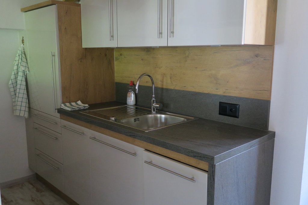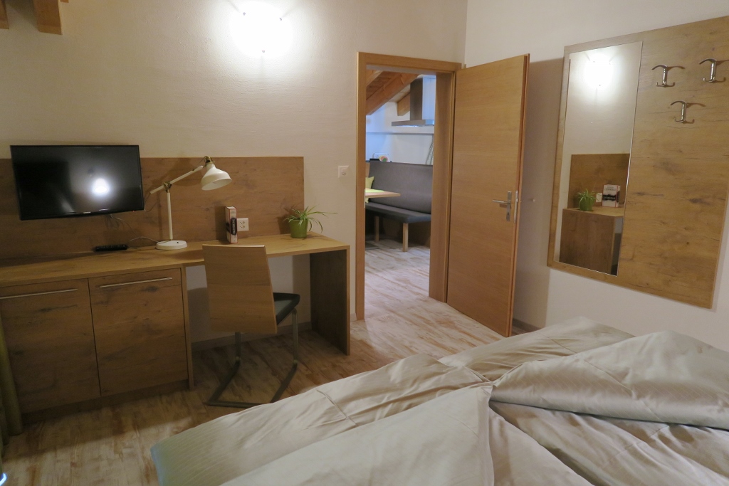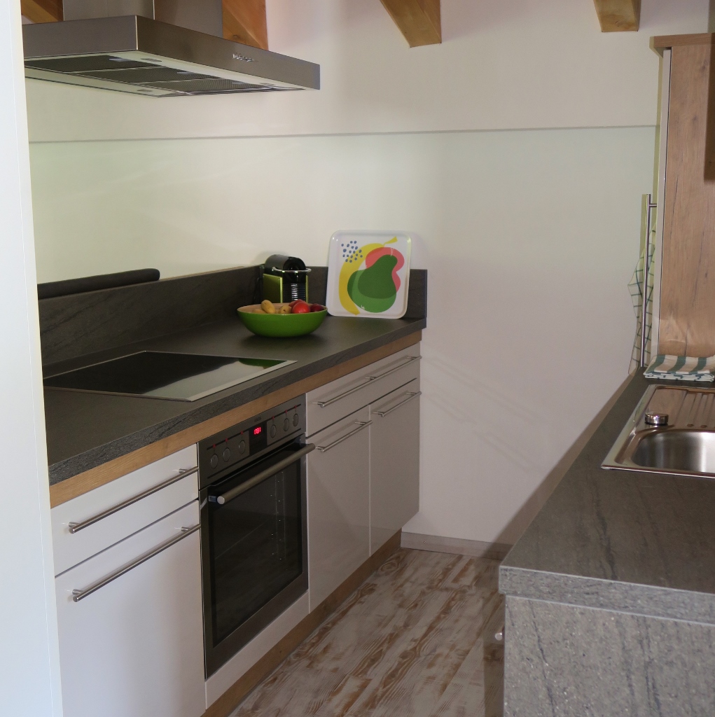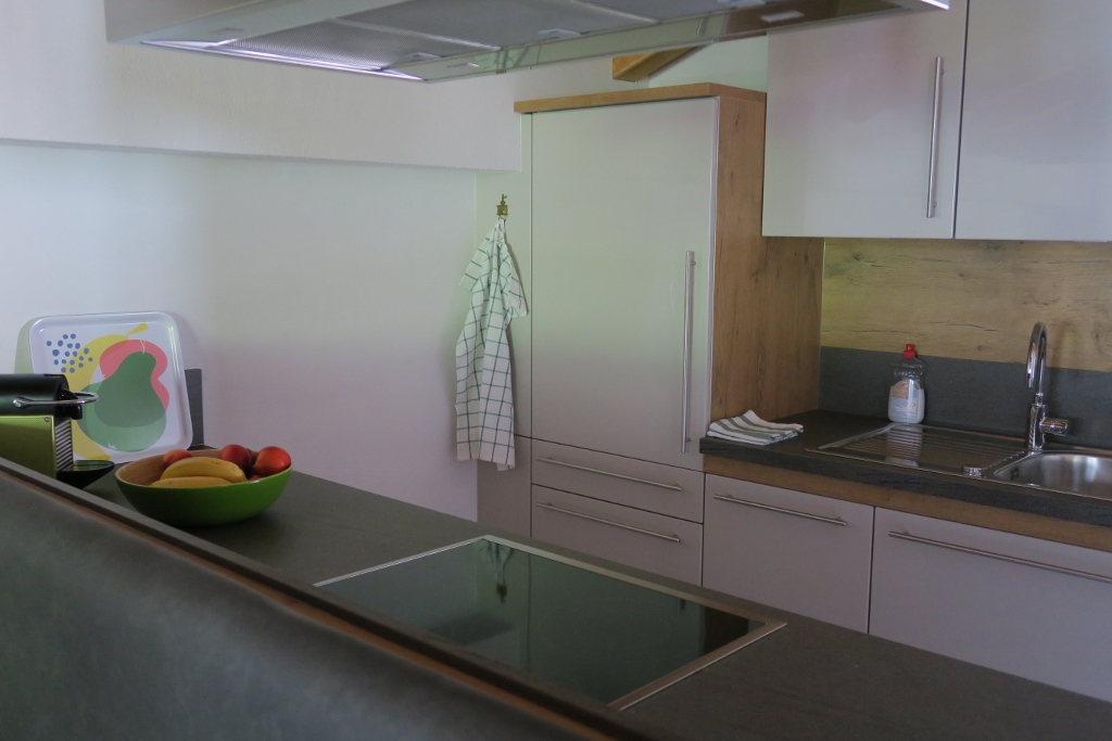 Wohnraum mit Küche (Geschirrspülmaschine, 4-Plattenherd mit Backofen, Kaffeemaschine, Nespressomaschine, Wasserkocher), Schlafzimmer mit Doppelbett, extra kleines Schlafzimmer für maximal 1 Erwachsenen oder 2 Kinder, Du/WC (Fön) und ein extra WC, zwei grosse Balkone südseitig.