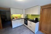 Wohnzimmer mit Satelliten-TV, WLAN und Sitzecke. Komplett eingerichtete, neue Küche mit Backofen, Wasserkocher, Geschirrspüler, Kaffeemaschine, Kühlschrank mit Gefrierfach.