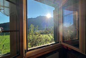 Balkon mit freier Sicht auf die Berge. Gartensitzplatz mit Gasgrill. Zwei Parkplätze vorhanden.