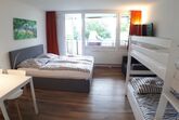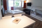Das 33m² großes Apartment bietet Platz für bis zu 5 Personen, die auf einem bequemen Boxspringbett (ca.160 cm x 200 cm) und einem Etagenbett nebst Ausziehbett (jeweils ca. 90cm × 200 cm) übernachten können.