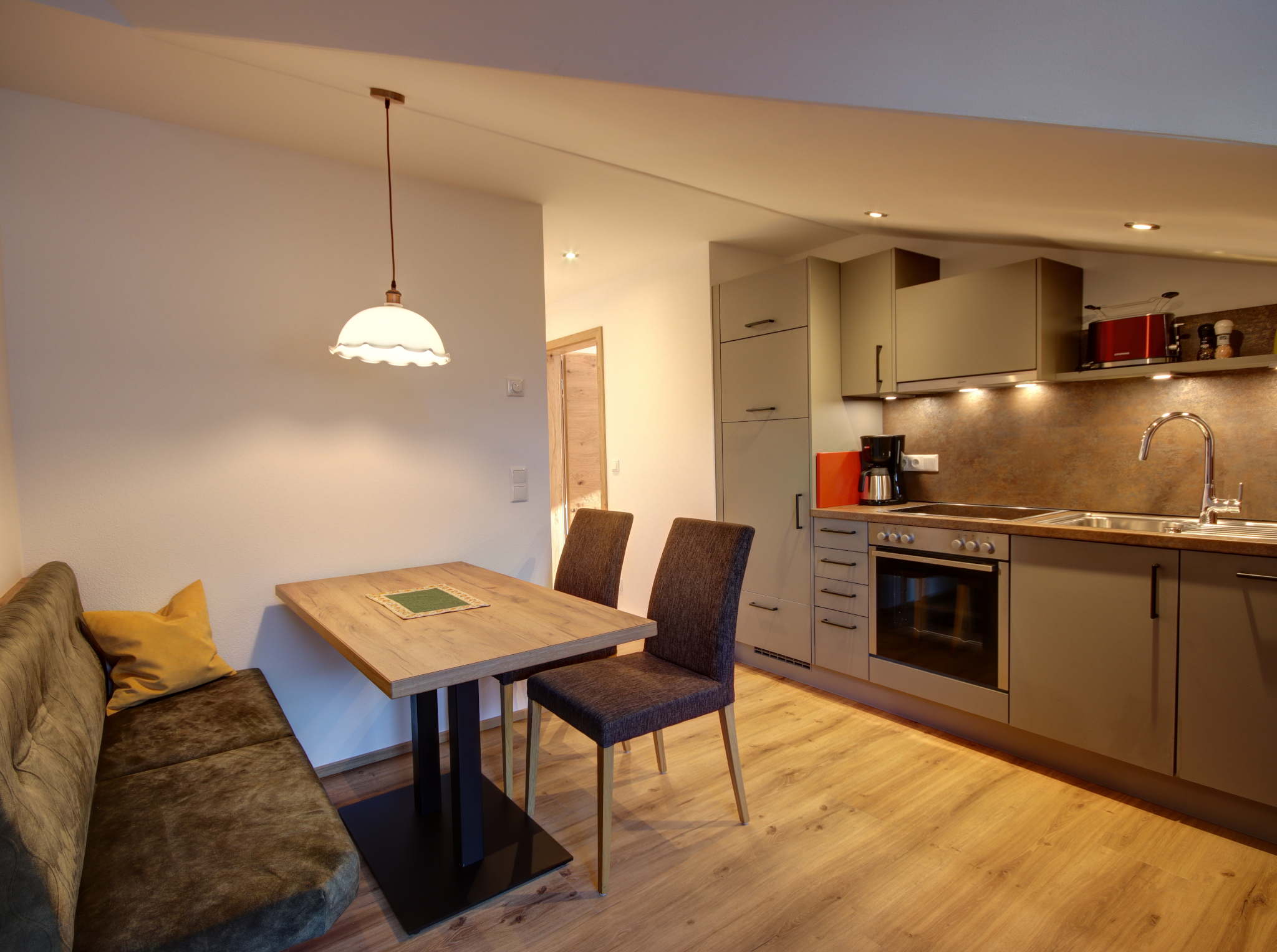 Küche ausgestattet mit Ceranfeld-Herd, Dunstabzug, Backofen, Kühlschrank mit Gefrierfach, Geschirrspüler, Toaster, Eierkocher, Wasserkocher, Töpfe, Teller, Besteck, usw.