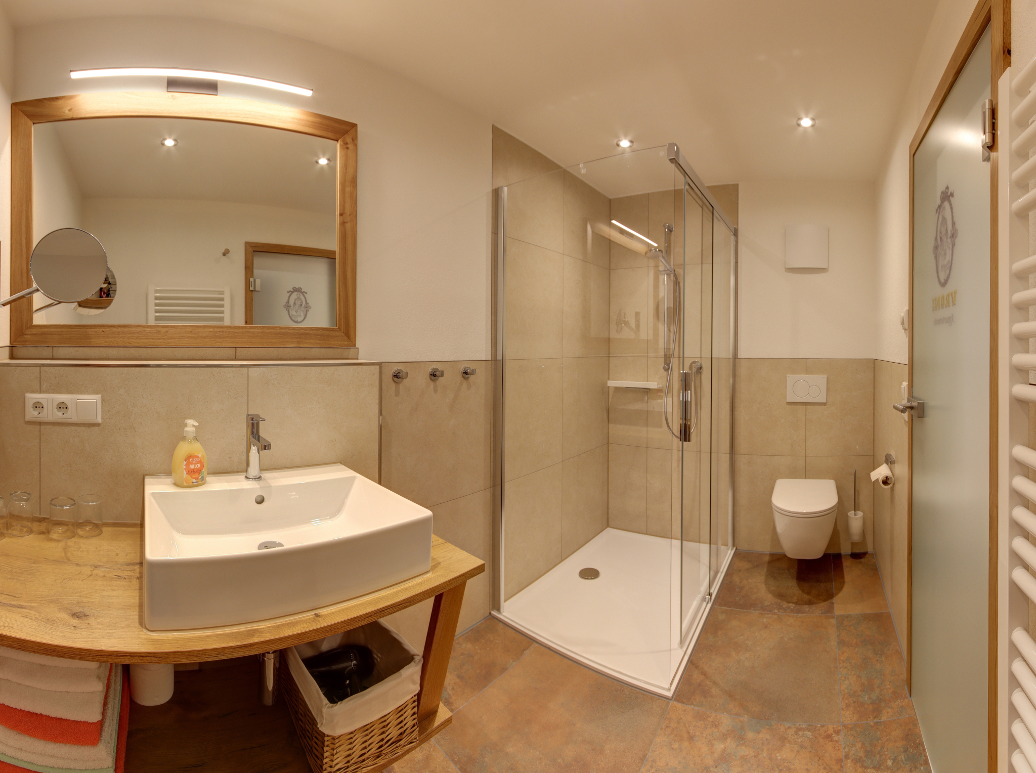 Badezimmer mit Glasdusche, Kosmetikspiegel, Handtuchtrockner, Föhn