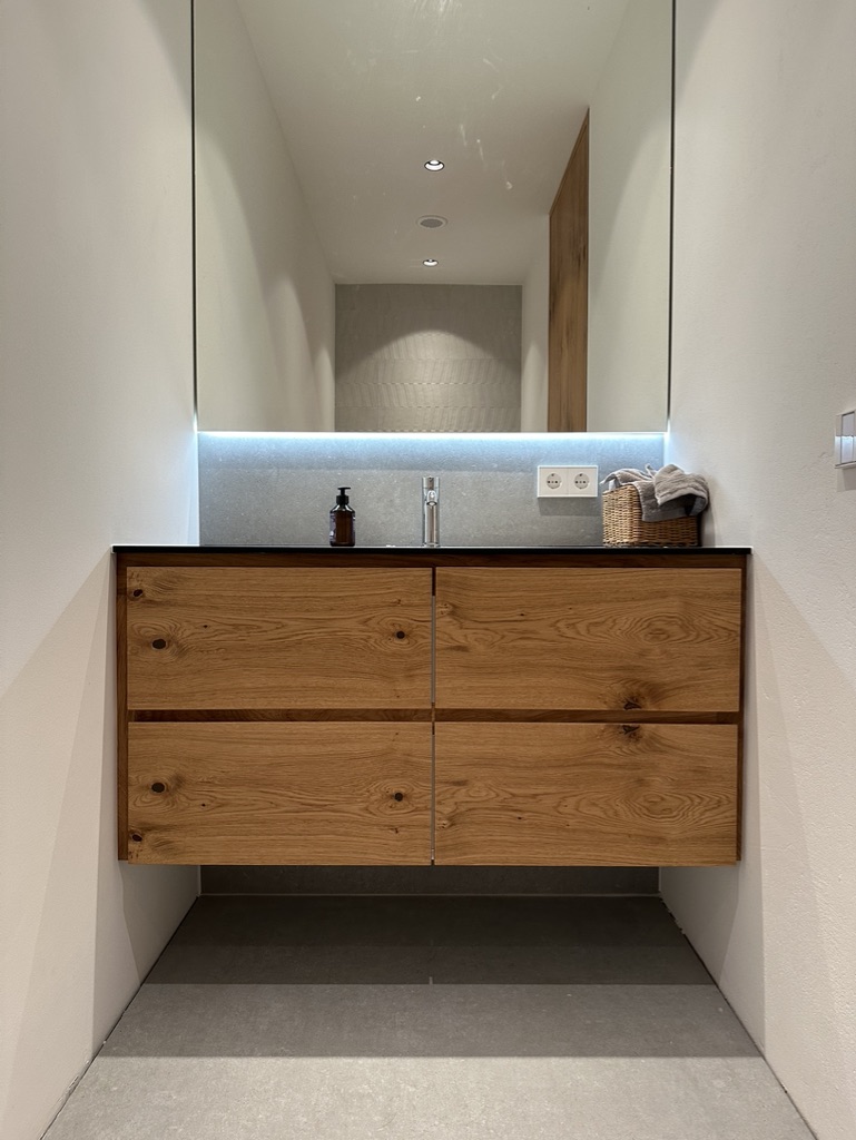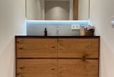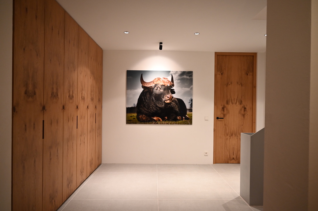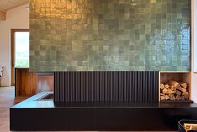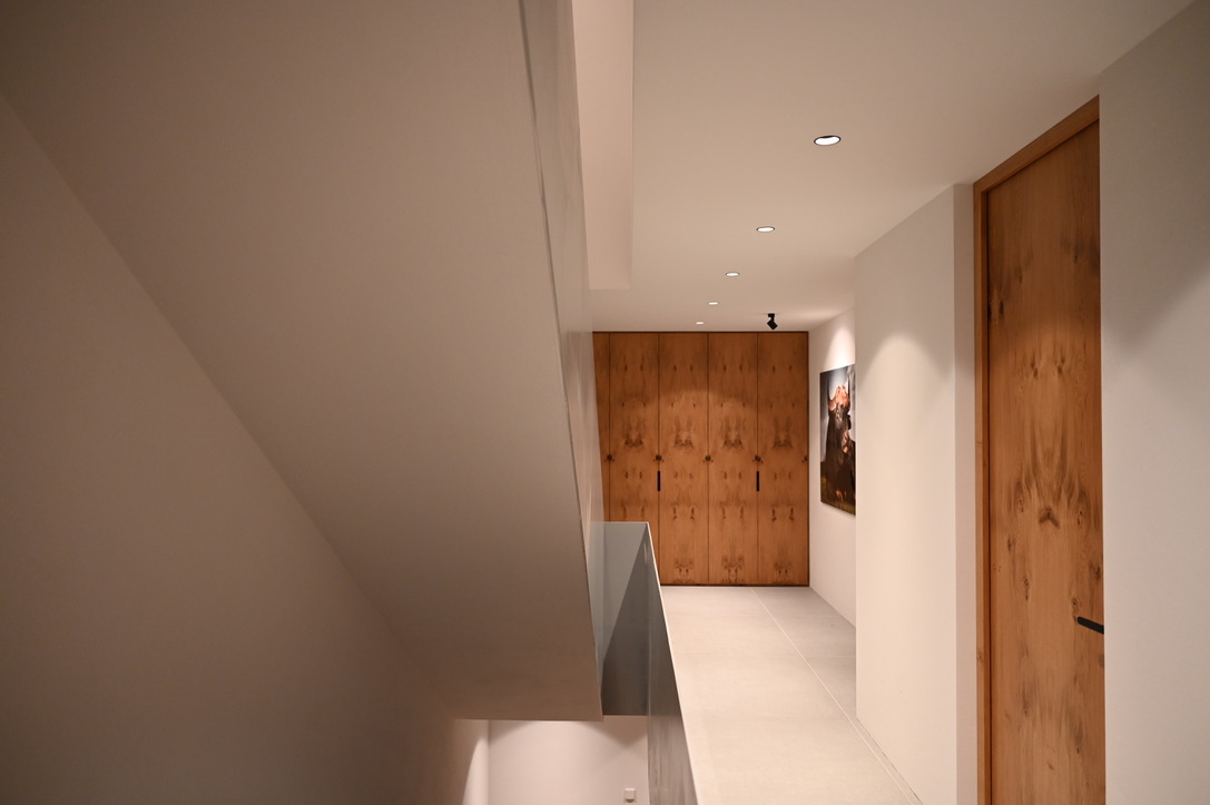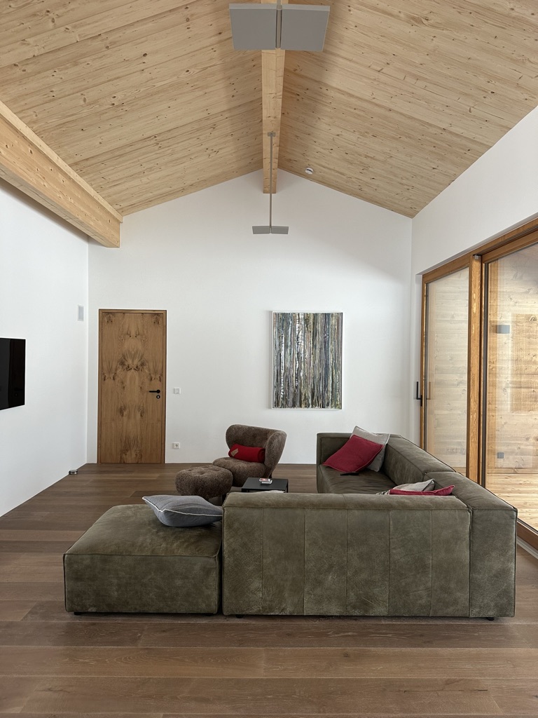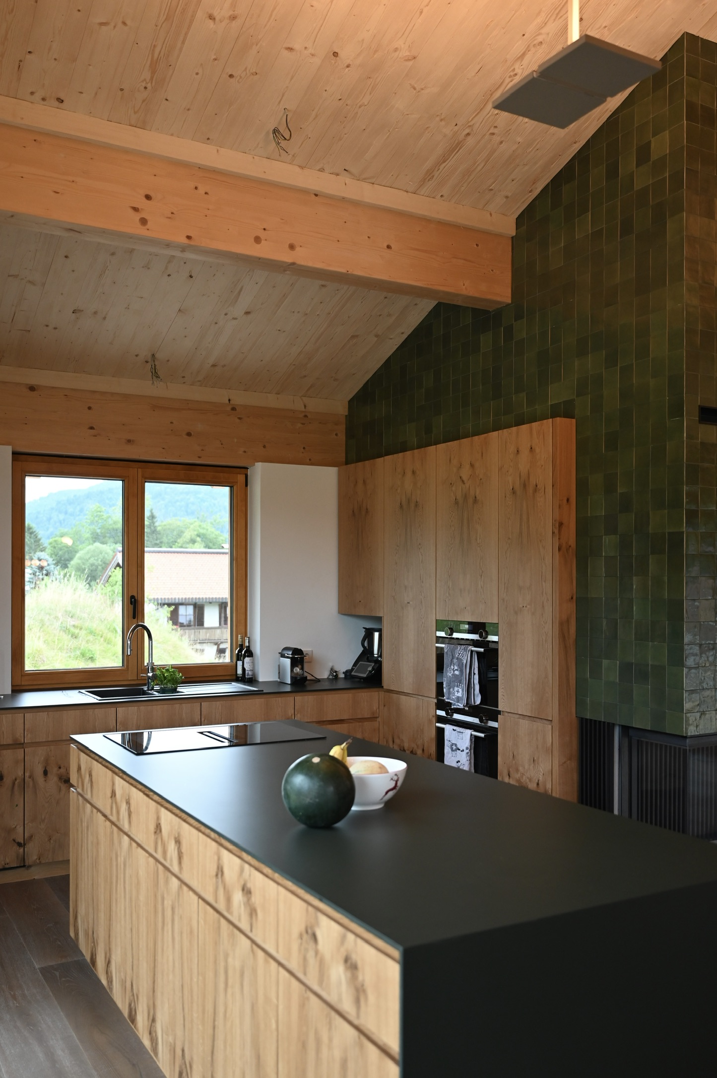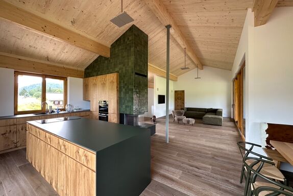 Das Haus hat im Obergeschoss einen offenen und hohen Wohnbereich mit Küche, Kochinsel und Wohnraum, bis zu 10 Personen können am großzügigen Tisch der Essecke Platz finden.