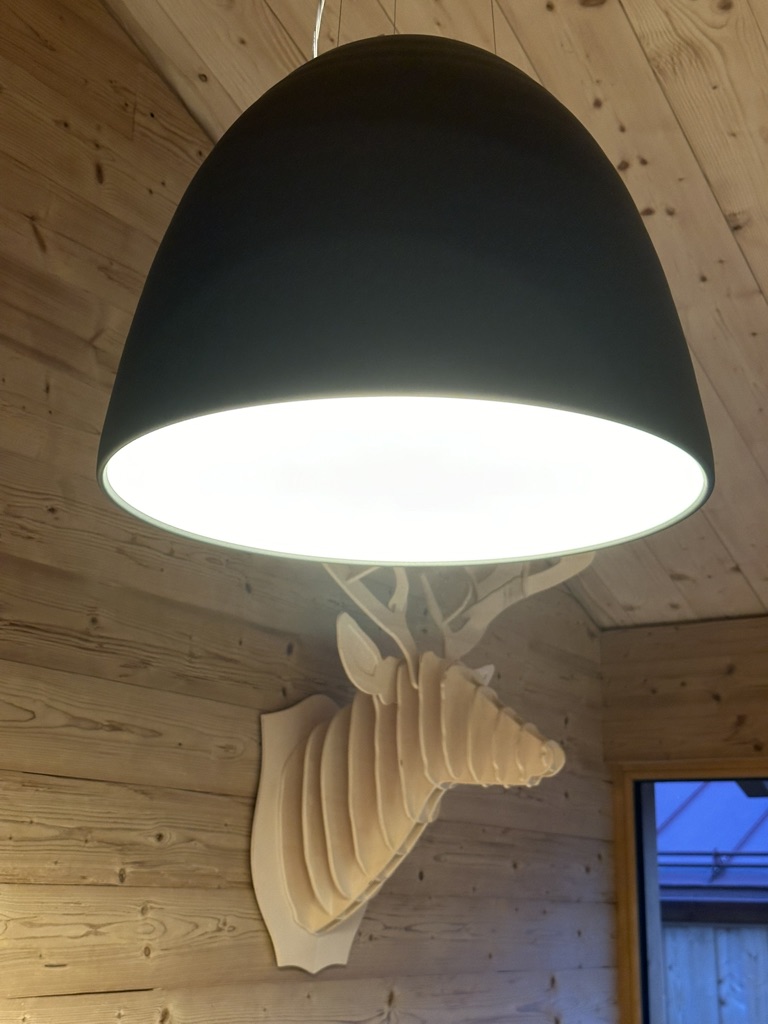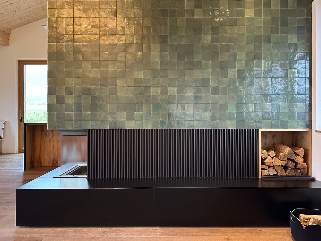 Der Dachstuhl ist komplett sichtbar, ein Kamin (Holz) steht als Raumteiler zwischen den Funktionen von Kochen und Wohnen.