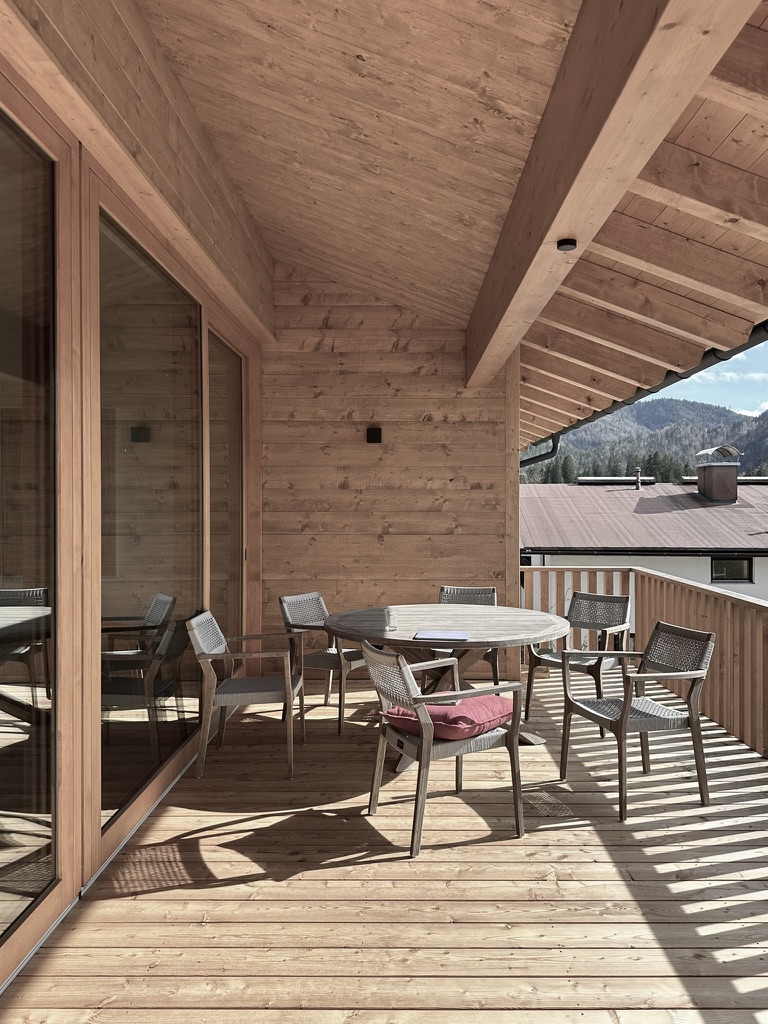 Zum Ferienhaus gehören eine großzügige überdachte Loggia und eine offene Terrasse im Obergeschoss sowie ein sonniger, südwestlich gelegener Garten.
