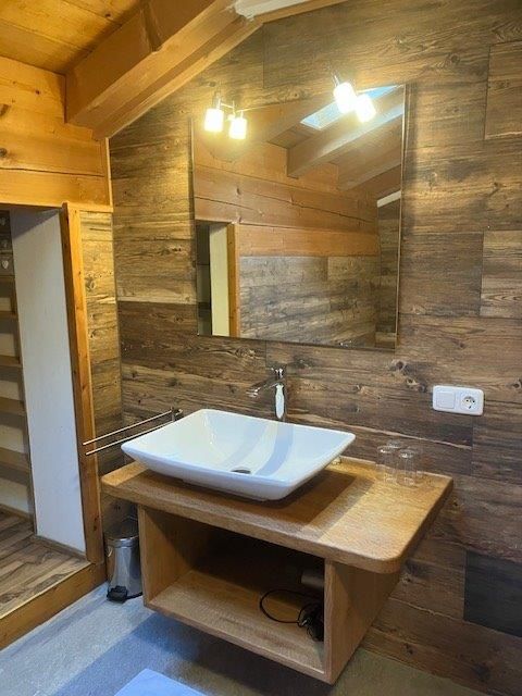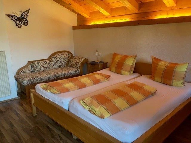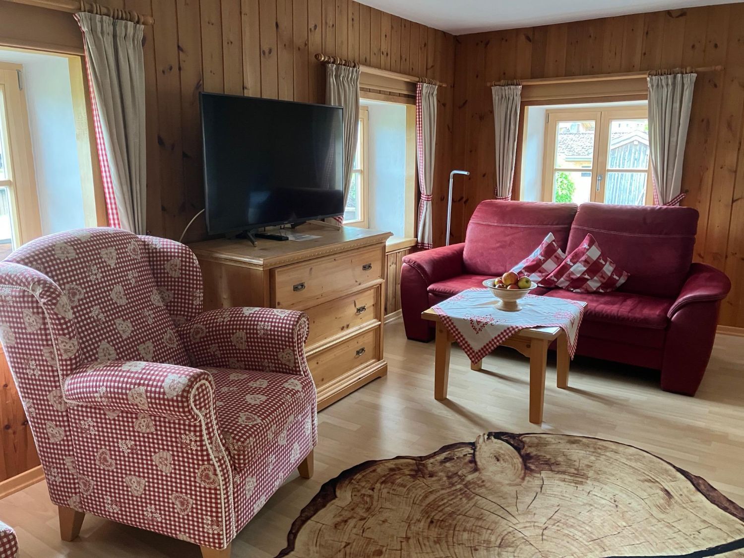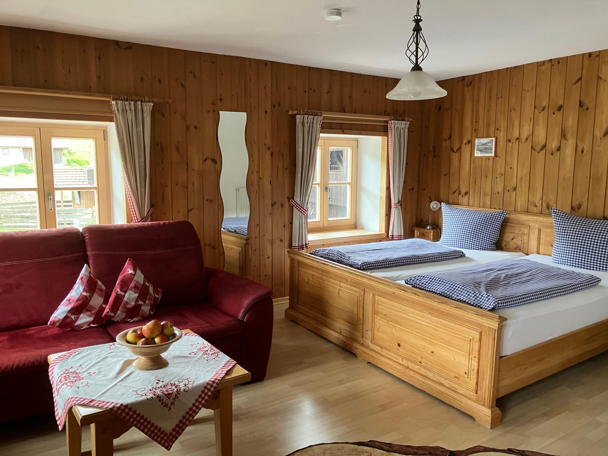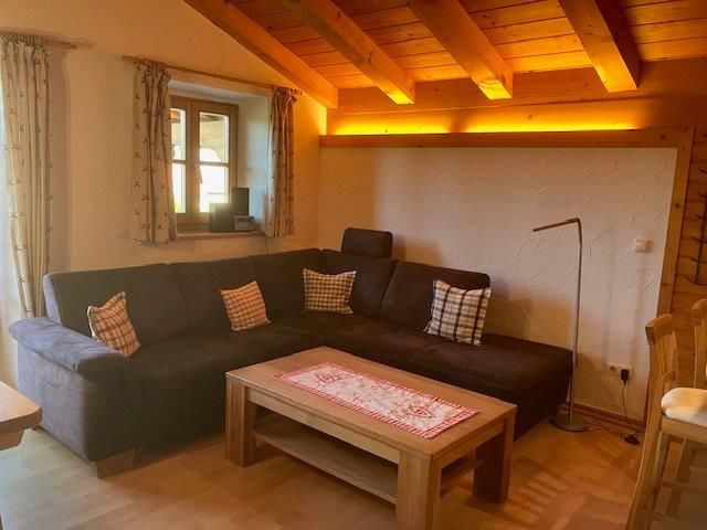 Bayrisch g´mütliche Ferienwohnung mit offenen Dachstuhl im 2. Stock mit Balkon. 2 getrennte Schlafräume mit Doppelbetten, je Bett 2 m x 1m. ein Wohnzimmer mit einer Rundcouch, eine Essecke und eine gut ausgestattete Küchenzeile mit 4- Platten Ceranfedl, Kaffeemaschine, Wasserkocher und Spülmaschine. Neu renoviertes Badezimmer mit Dusche und Badewanne. Die Toilette ist extra. Die Wohnung ist so eingerichtet, dass Sie sich wie Zuhause fühlen. Besondere Wünsche erfüllen wir gerne!!