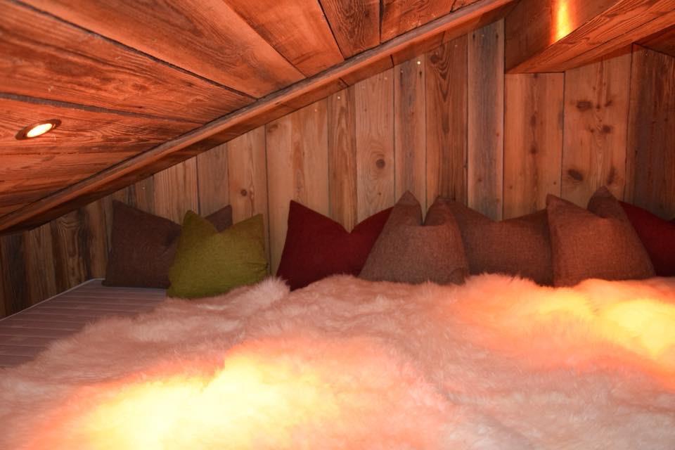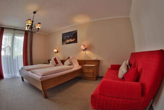 Ausstattung: grosses Doppelbett und eine ausziehbare Liegecouch, teilweise Trennwand mit 2 TV, grosszügiges Bad