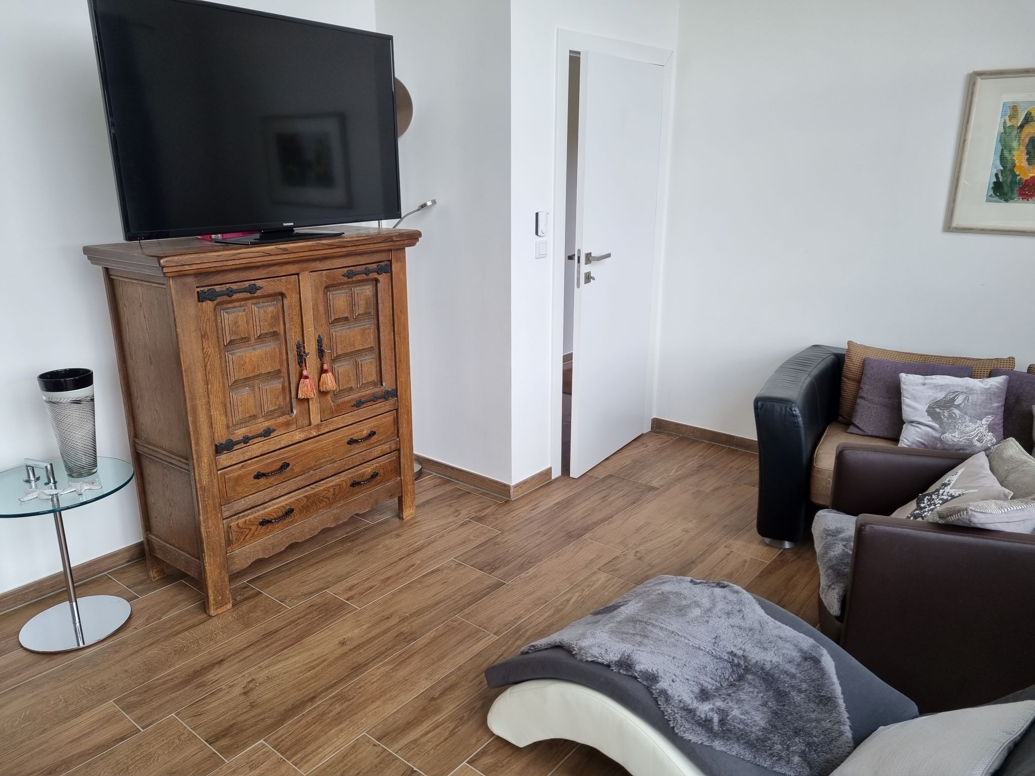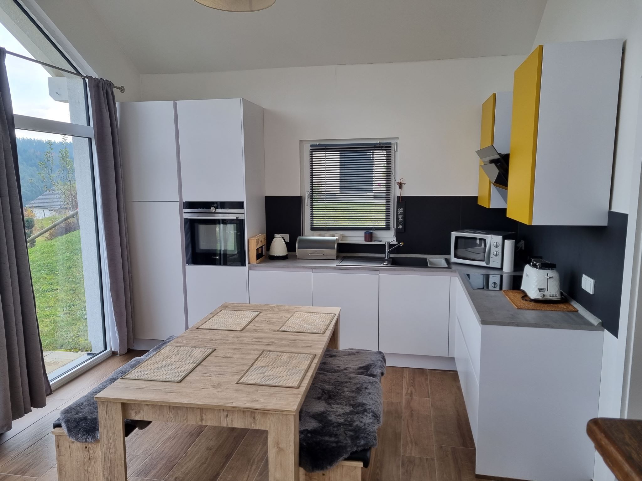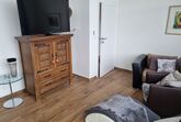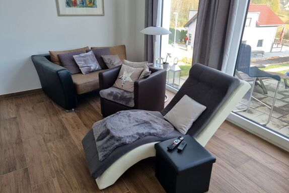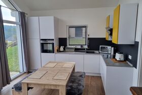 Großzügiges Wohn- / Esszimmer mit Flat-TV, gemütliche Sitzecke, Essbereich mit Sitzbänken und vollständig ausgestatteter Küche: Herd mit Ceranfeld und Backofen, Kühlschrank mit Gefrierfach, Kaffeemaschine (Senseo Pad), Wasserkocher, Toaster, Geschirrspülmaschine und mit Standard-Küchen- und Geschirrinventar komplett ausgestattet.