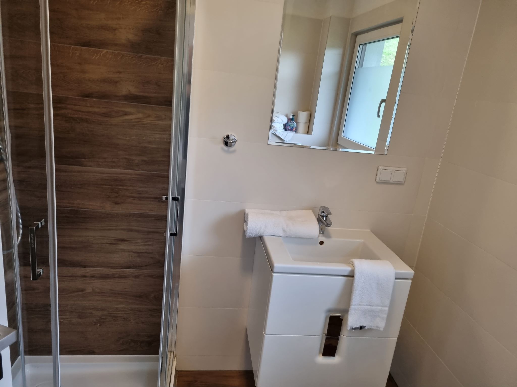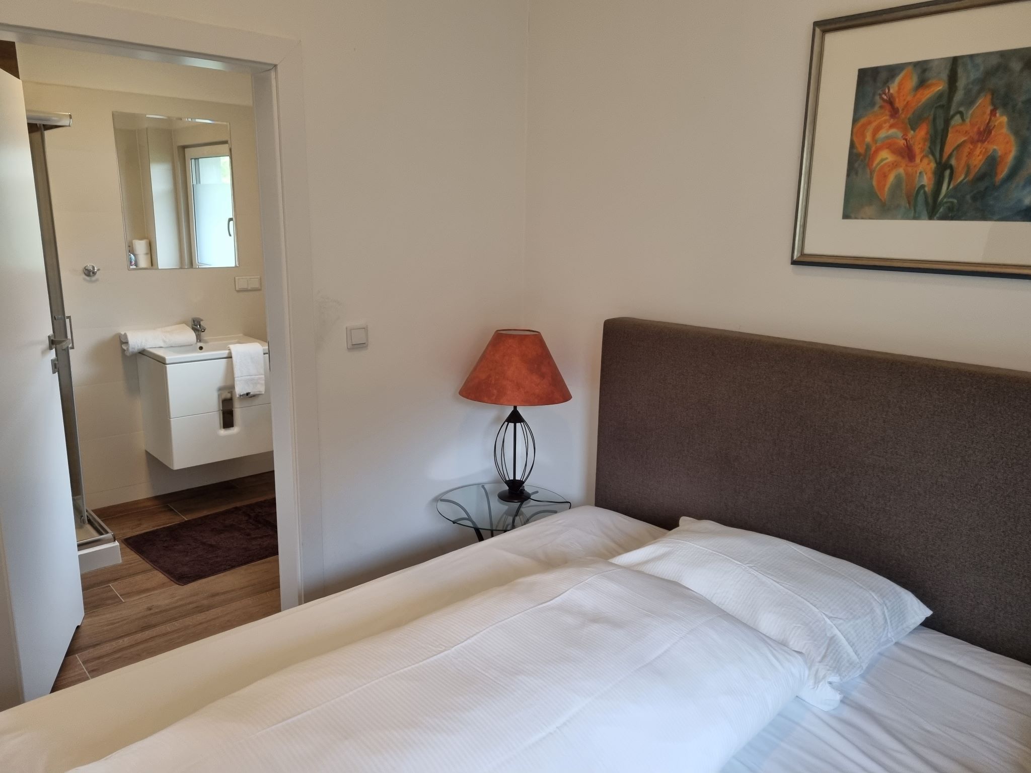 2x Schlafzimmer (2x Doppelbett) mit jeweils einem direkt begehbaren privaten Badezimmer Dusche/WC. In einem Schlafzimmer ist ein Zusatz- oder Kinderbett möglich.