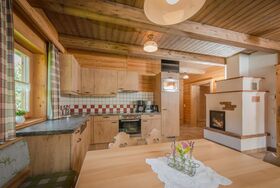 • Holz-Kachelofen, hochwertige Bauweise in natürlichem Holz aus dem eigenen Wald