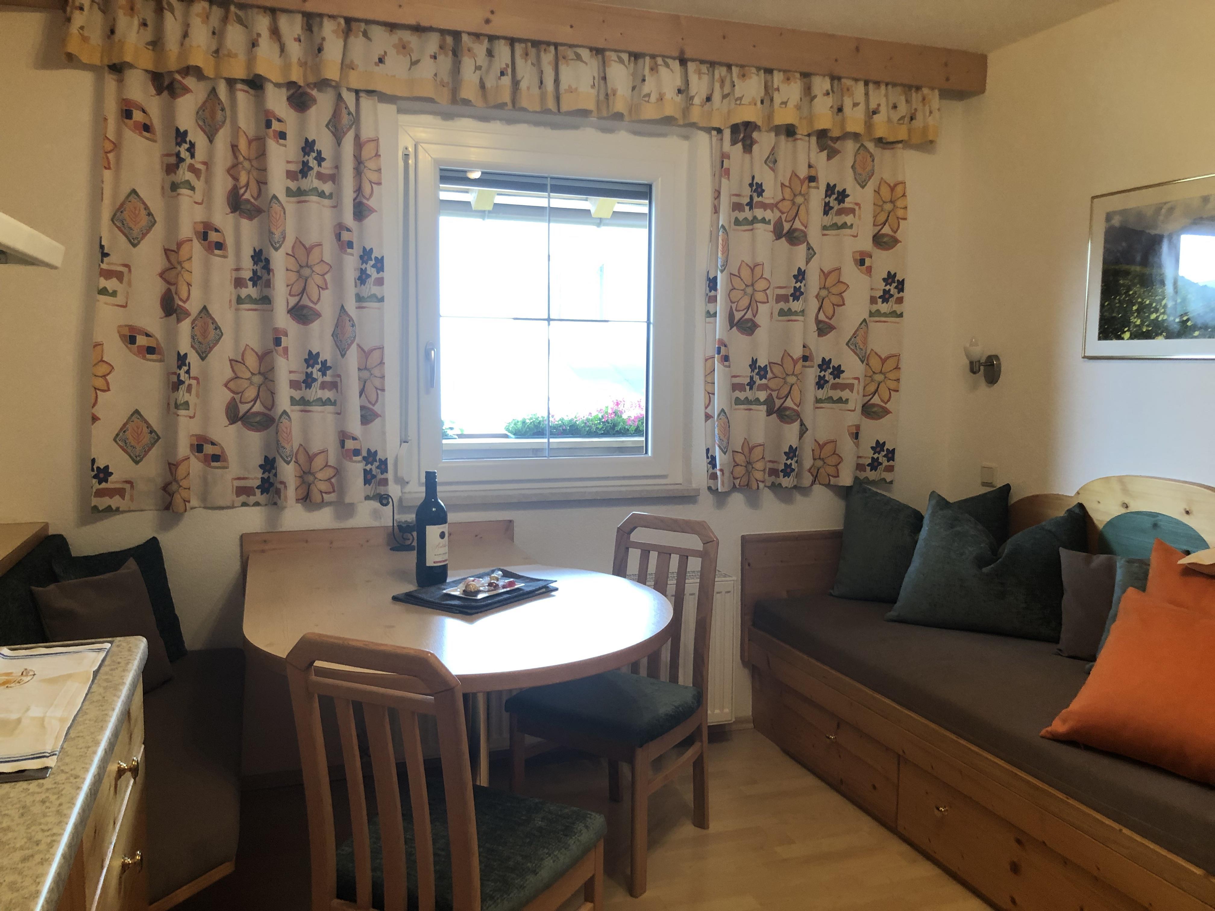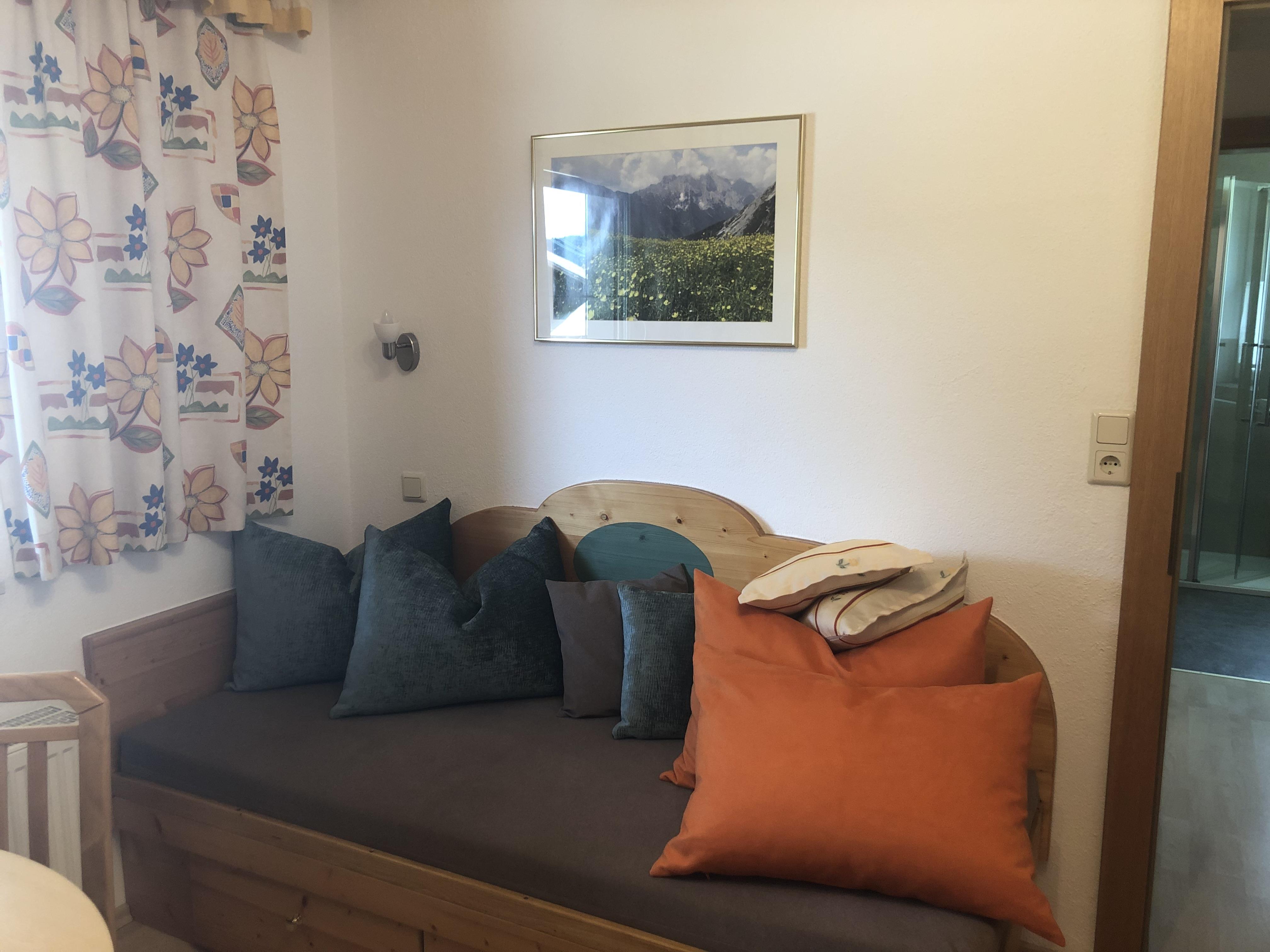 Helle Wohnung im 1. Stock mit Südwestbalkon, Wohnraum mit Küchenzeile (inkl. Vierplattenherd, Geschirrspüler, Mikrowelle, Kaffeemaschine, Toaster, Wasserwärmer, etc.), Sitzecke, Einzelbett, SAT-TV, Schlafzimmer, DU/WC, überdachter Autoabstellplatz nach Verfügbarkeit;