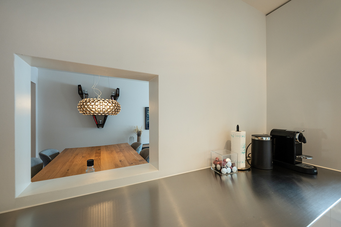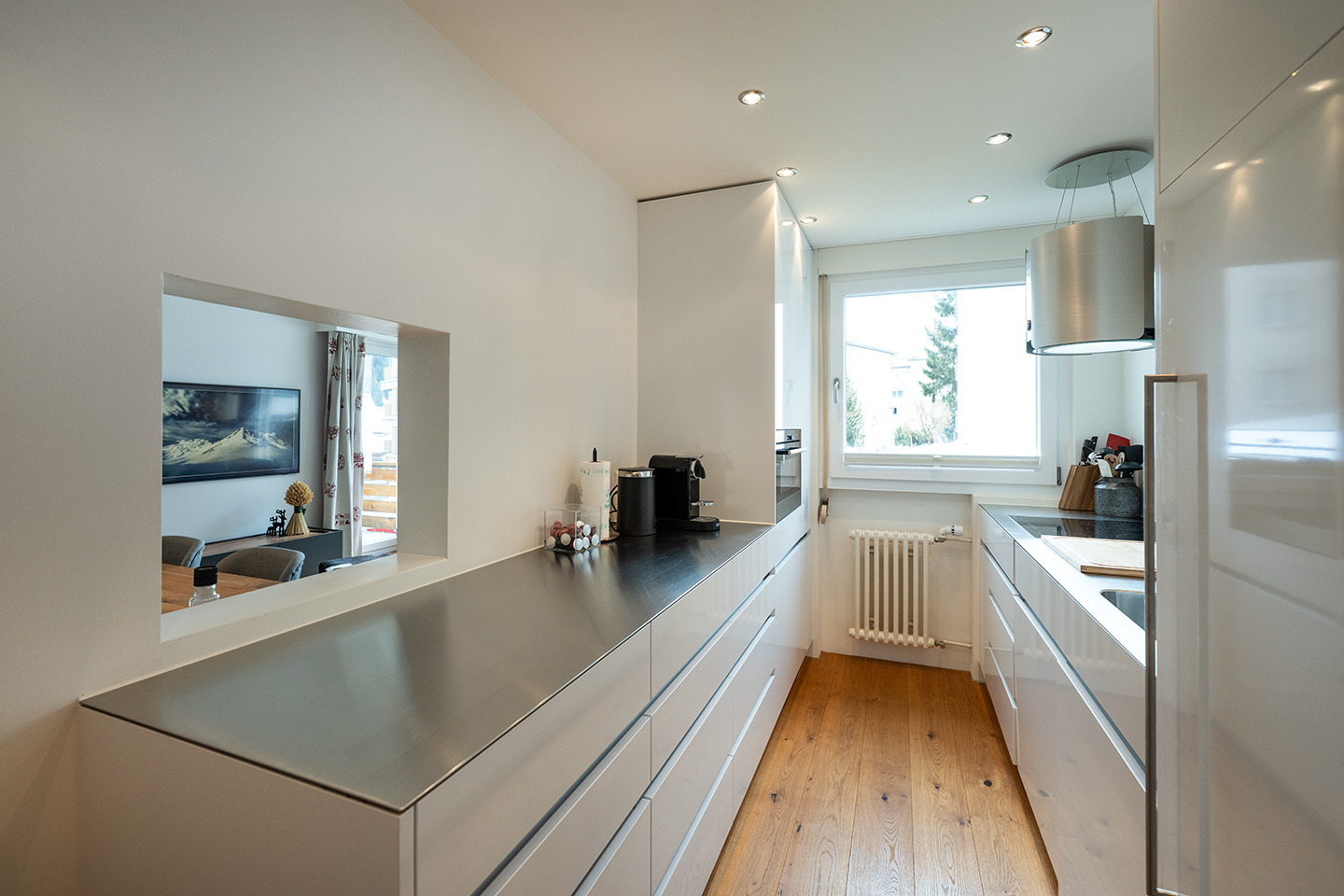 Separate Küche mit Fenster und Dampfabzug, mit 4-Platten Glaskeramikherd, Kühlschrank mit Tiefgefrierfach, Backofen, Geschirrspüler, Kapsel Kaffeemaschine (Nespresso).