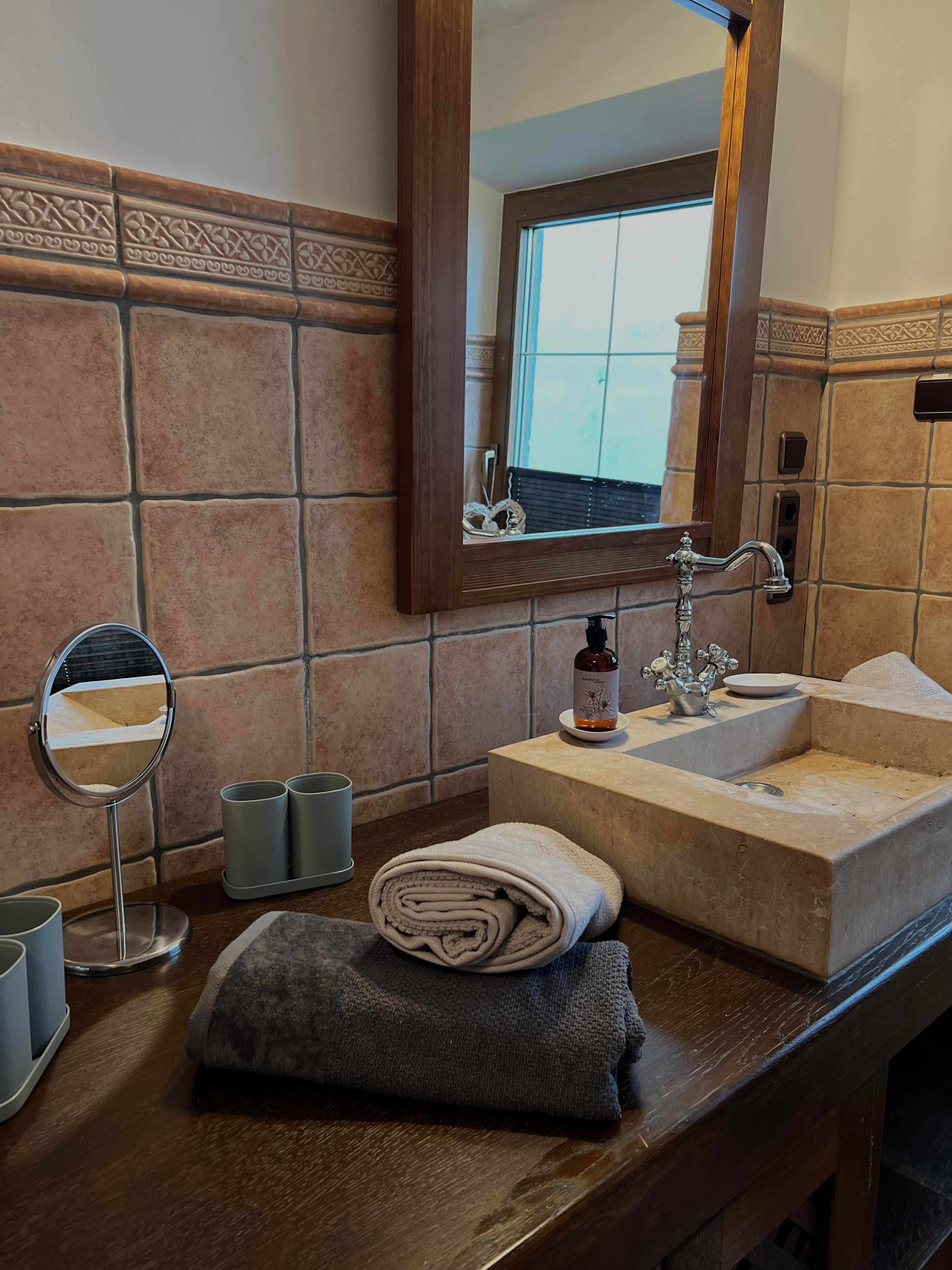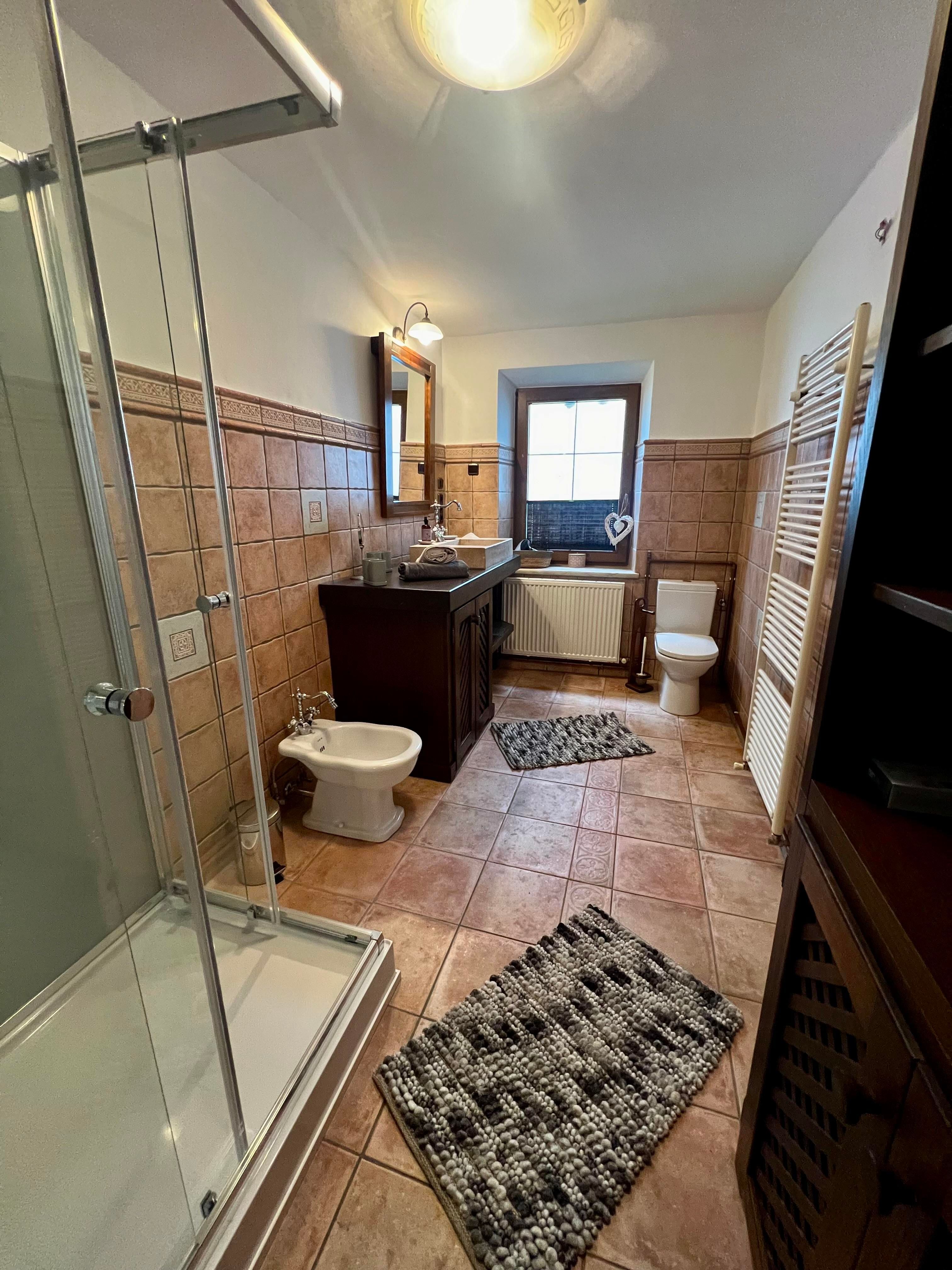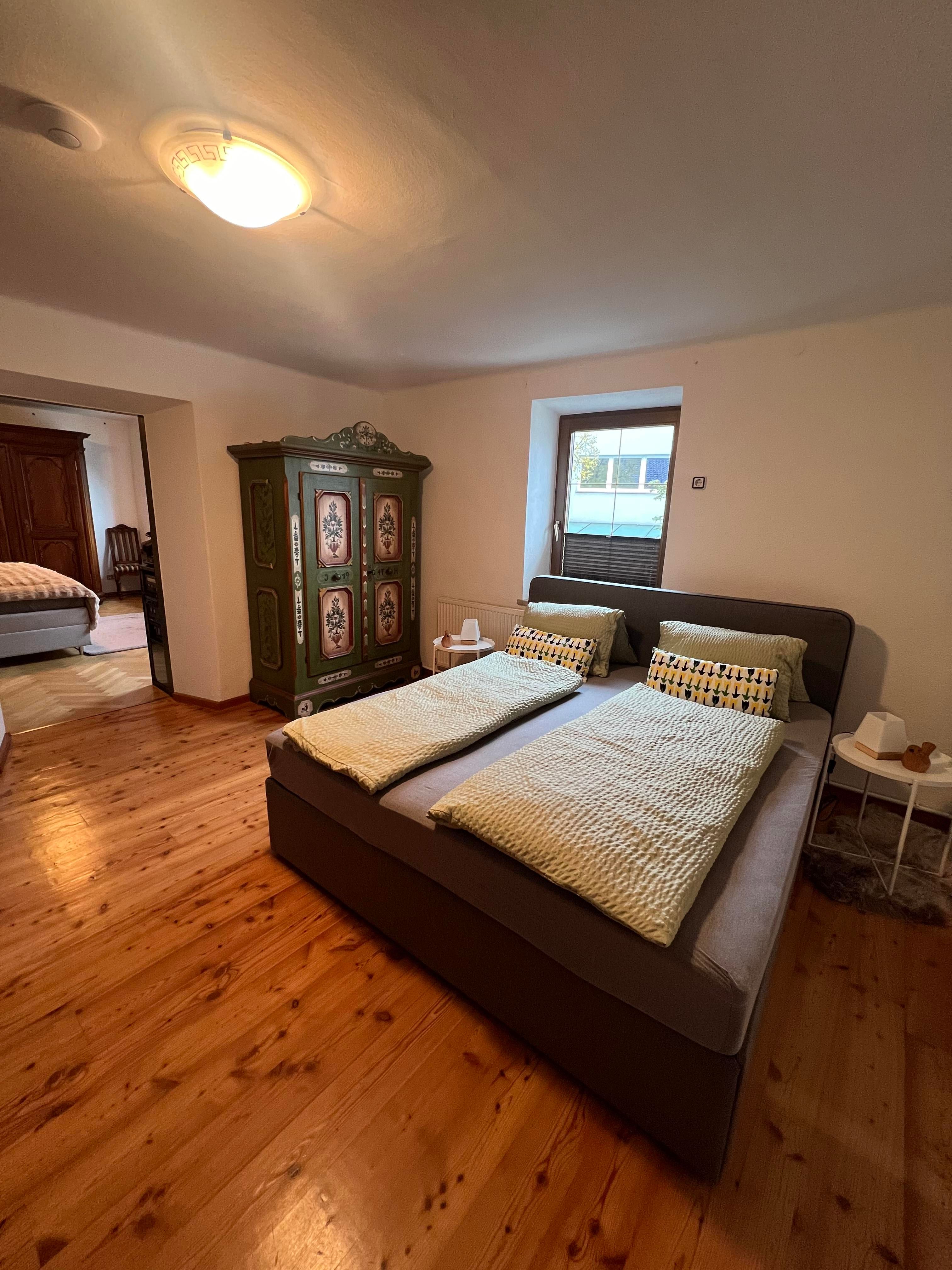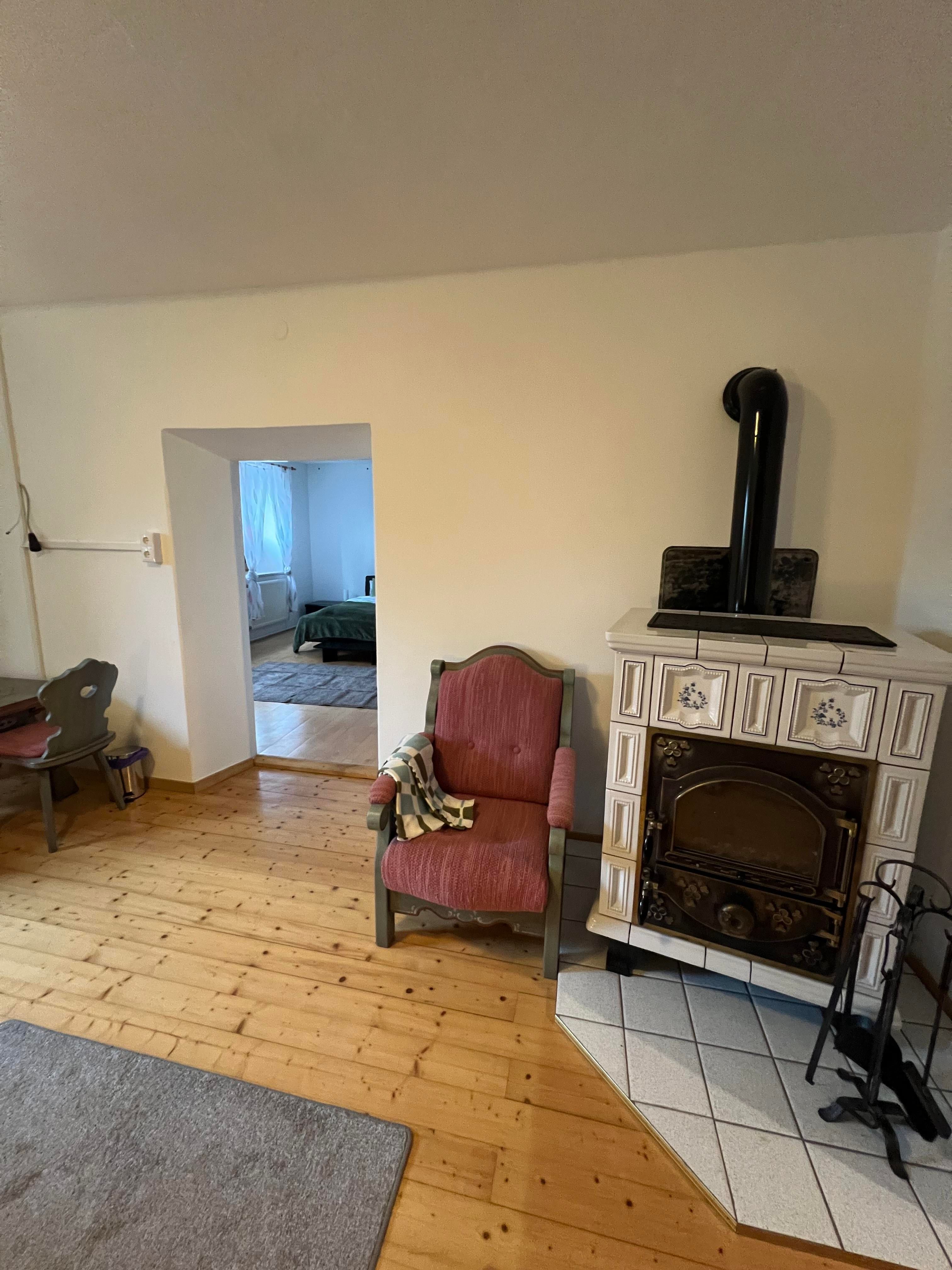 Die Wohnung besteht aus 4 Schlafzimmern, die jeweils miteinandner verbunden sind, Badezimmer und 2 separaten WC, einer Küche und einer gemütlichen Stube.