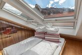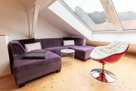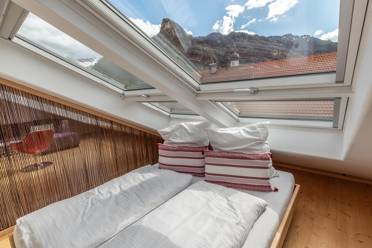 Im Dachgeschoss befindet sich eine großzügige Ferienwohnung (für bis zu 4 Personen) mit traumhaftem Blick auf den Kofel. Durch ein ca. 2 * 2 Meter großes Dachfenster lässt sich die Sitzecke im Wohnbereich zu einem Freisitz wandeln. Der Wohnbereich ist ausgestattet mit einem großen Sofa, zwei Sesseln und einem Flachbild Satelliten-TV. Zusätzlich bietet der Wohnbereich einen Essbereich sowie einen optisch abgetrennten Schlafbereich für 2 Personen (160 * 200 cm Bett). Für weitere 2 Personen ist Platz im separaten Schlafzimmer mit einem großen Doppelbett (180 * 200 cm). Die Ferienwohnung verfügt außerdem über ein Bad mit Duschwanne / WC und eine eigene Küche. In der Wohnung steht Ihnen WLAN kostenfrei zur Verfügung. Die Wohnung ist eine Nichtraucher-Wohnung.